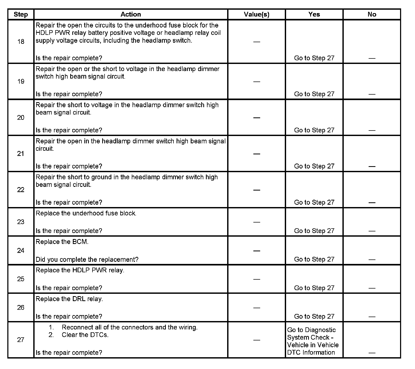 15. This step tests the headlamp dimmer switch high beam signal circuit for an open or short to voltage.