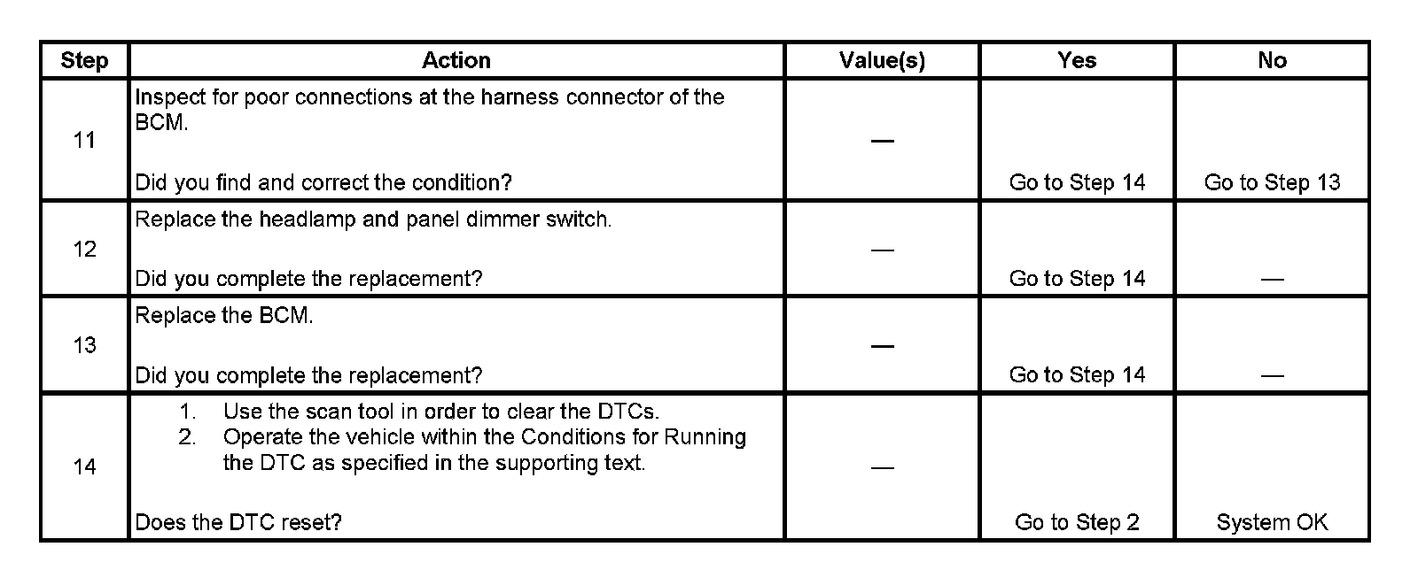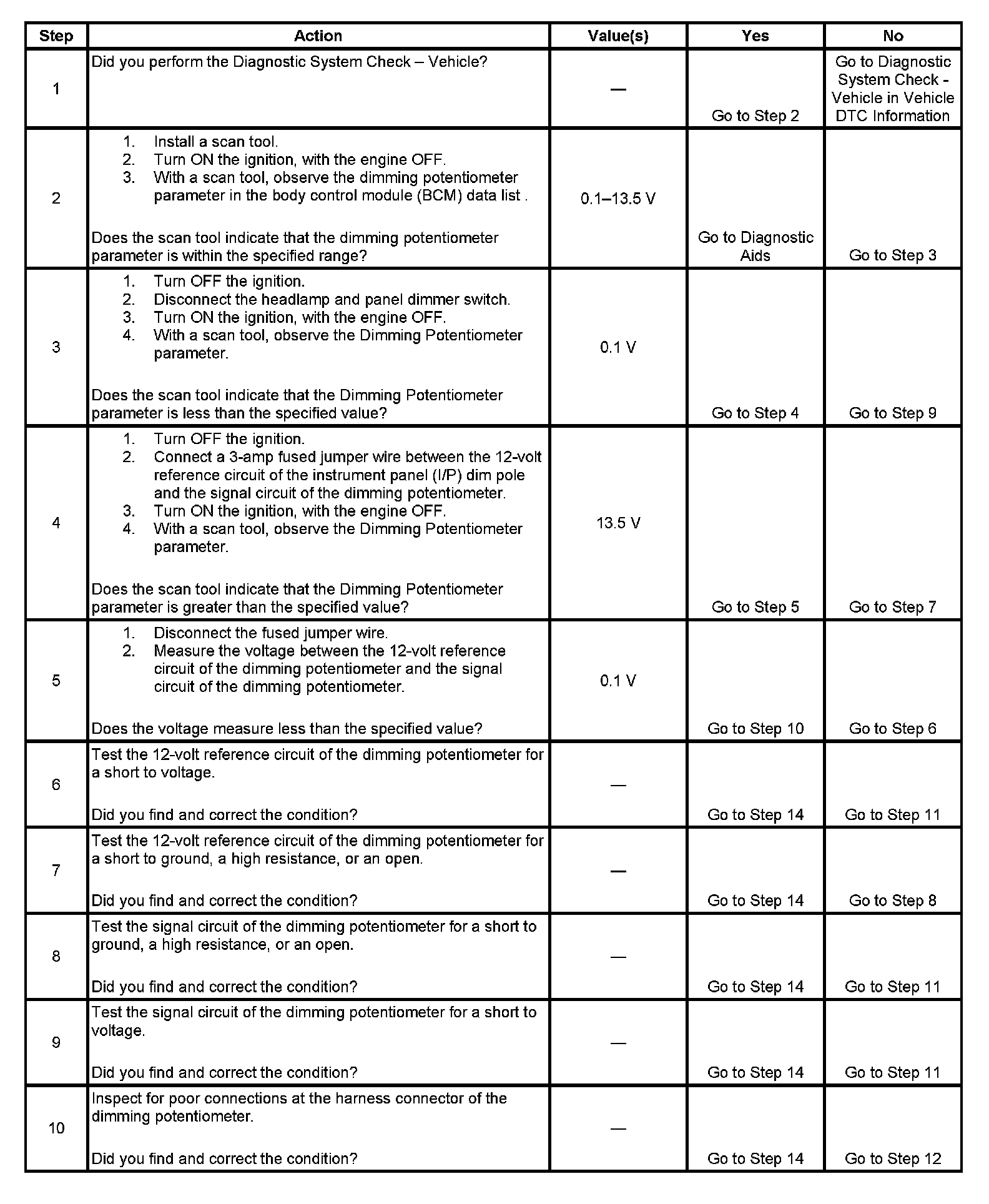 The numbers below refer to the step numbers on the diagnostic table.