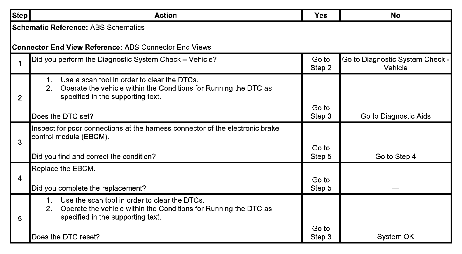 ^ After the DTC is cleared and the ignition is ON, the ABS indicator may remain ON until the EBCM completes a power-up self-test. This test concludes when the vehicle reaches a speed greater than 13 km/h (8 mph) and the wheel speeds are verified by the EBCM.