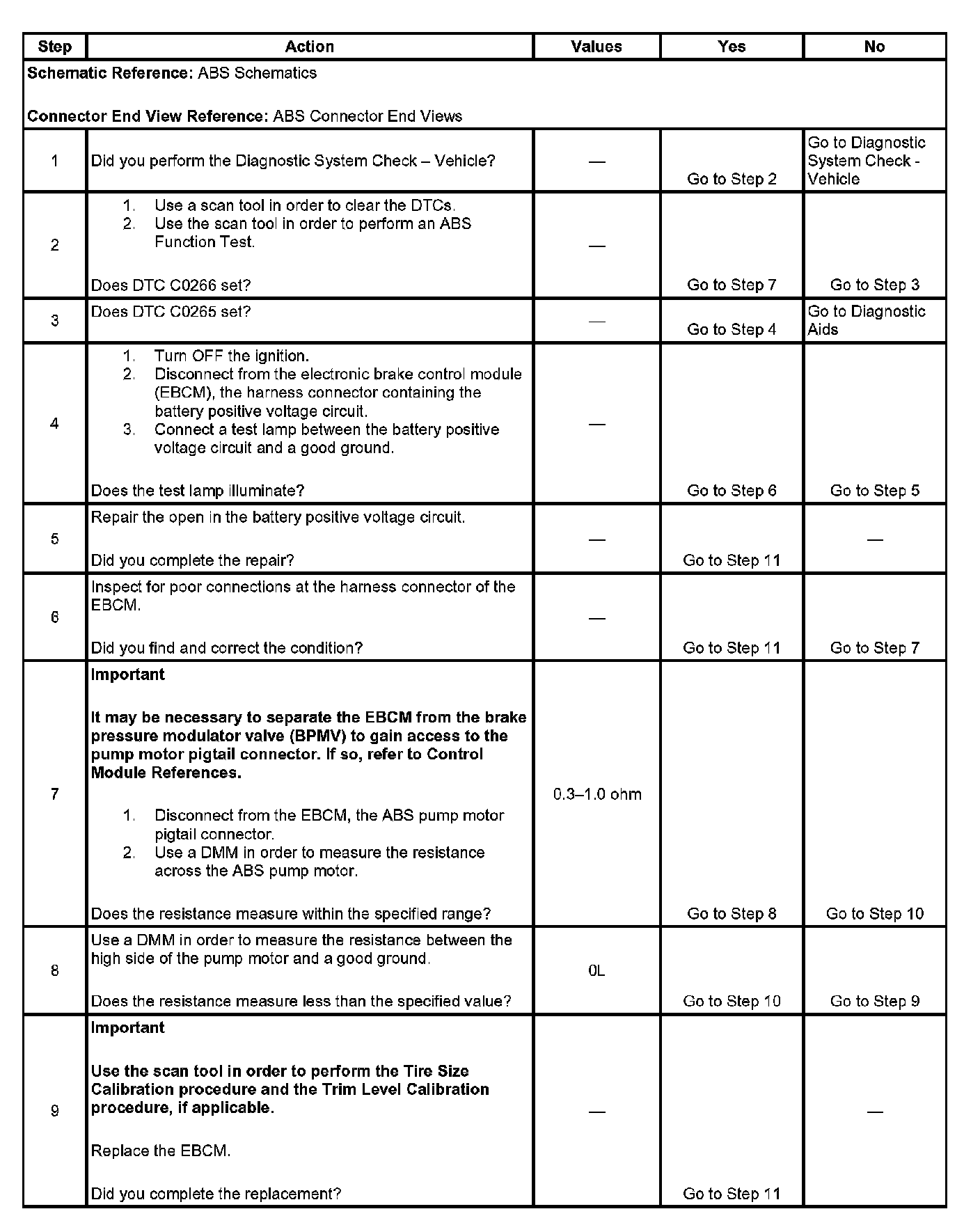Important: Whenever the EBCM is replaced for DTC C0265 or C0266, the ABS pump motor and motor circuitry must be tested for the proper resistance. Refer to steps 7 and 8 in the diagnostic table for testing procedures and resistance values.