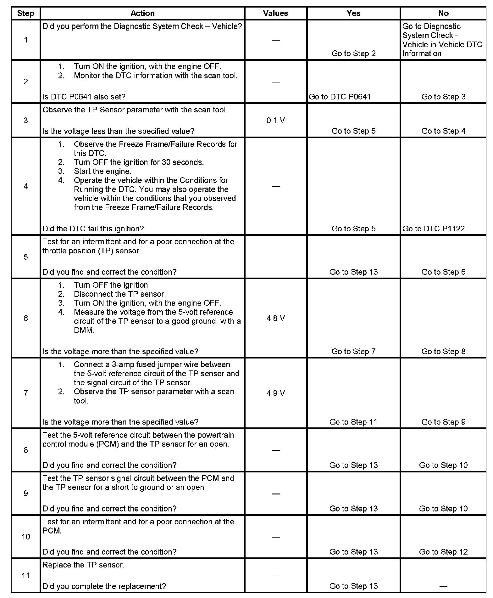 The PCM provides the TP sensor with 5 volts on the 5-volt reference circuit and a ground on the low reference circuit. Rotation of the TP sensor rotor from the closed throttle position to the wide open throttle (WOT) position provides the PCM with a signal voltage from less than 1 volt to more than 4 volts through the TP sensor signal circuit. If the PCM detects an excessively low signal voltage, DTC P0122 sets.