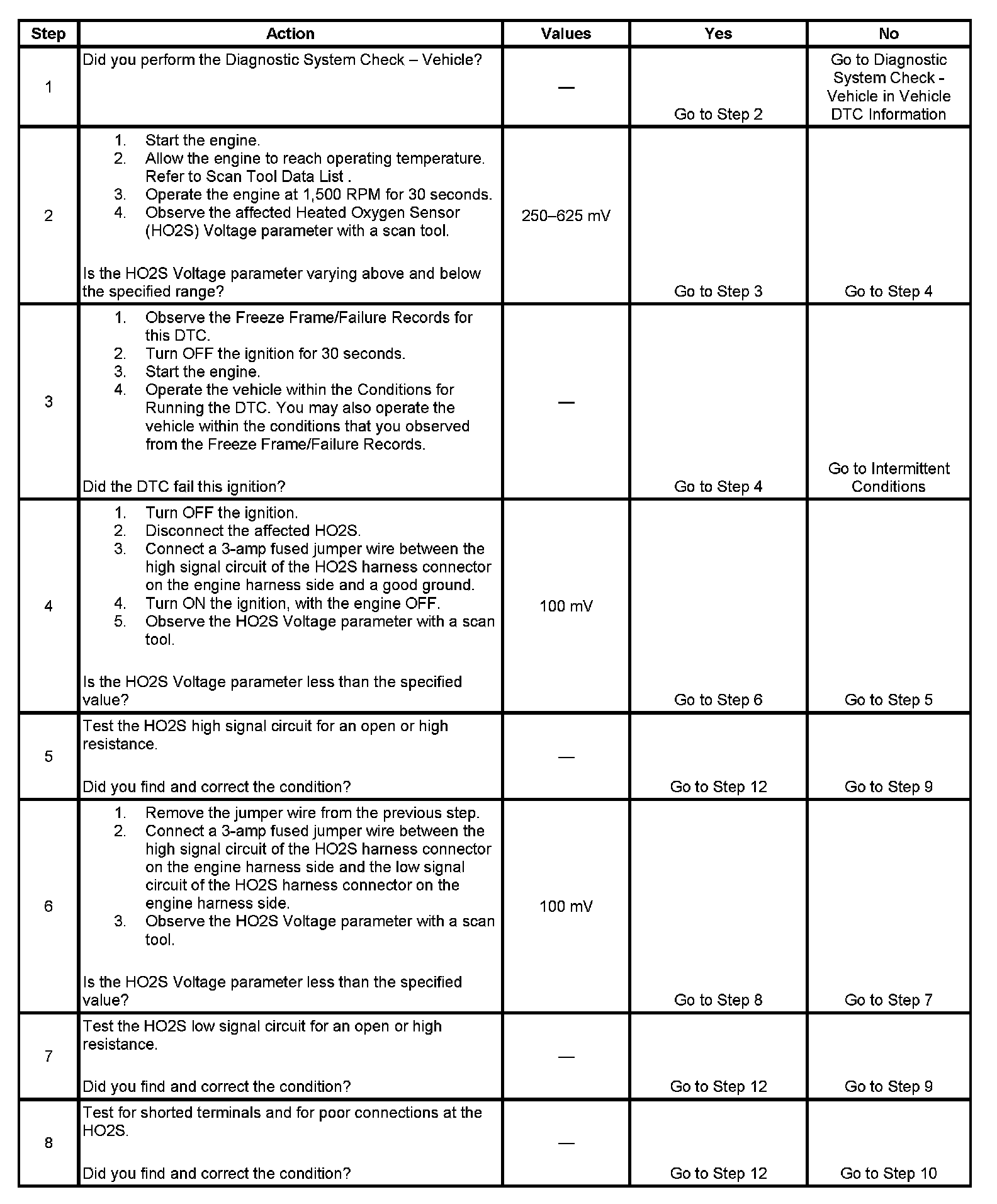 Heated oxygen sensors (HO2S) are used for fuel control and post catalyst monitoring. Each HO2S compares the oxygen content of the surrounding air with the oxygen content in the exhaust stream. The HO2S must reach operating temperature to provide an accurate voltage signal. Heating elements inside the HO2S minimize the time required for the sensors to reach operating temperature. The powertrain control module (PCM) supplies the HO2S with a reference, or bias, voltage of about 450 mV. When the engine is first started the PCM operates in Open Loop, ignoring the HO2S voltage signal. Once the HO2S reaches operating temperature and Closed Loop is achieved, the HO2S generates a voltage within a range of 0-1,000 mV that fluctuates above and below bias voltage. High HO2S voltage indicates a rich exhaust stream, low HO2S voltage indicates a lean exhaust stream. This diagnostic will only run once per ignition cycle. The PCM monitors the rich-to-lean and lean-to-rich transition time. A transition is defined as, the HO2S voltage changes from above 625 mV to below 250 mV or from below 250 mV to above 625 mV. If the PCM detects that the transition time is too long, DTC P0133 sets for HO2S bank 1 sensor 1, or DTC P0153 sets for HO2S bank 2 sensor 1.