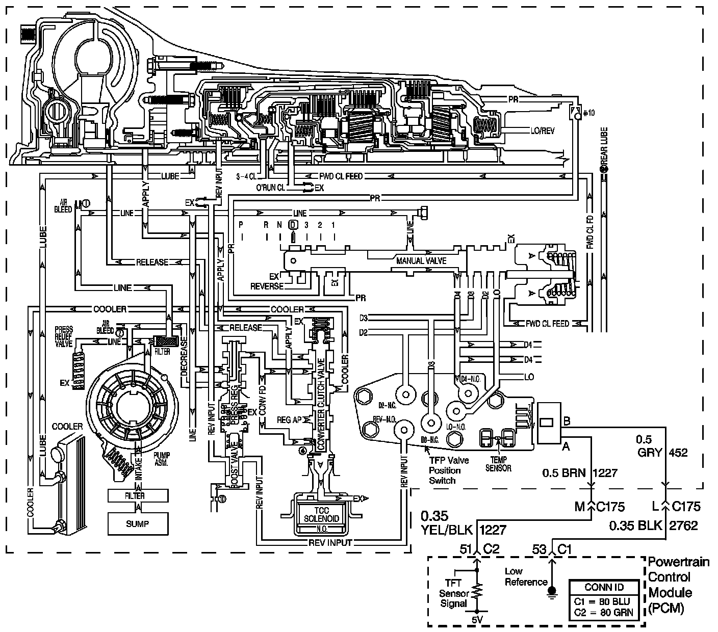 The flow of transmission fluid starts in the bottom pan and is drawn through the filter, control valve body assembly, transmission case and into the oil pump assembly. The oil pump assembly pressurizes the fluid and directs it to the pressure regulator valve where it becomes the main supply of fluid to the various components and hydraulic circuits in the transmission. Hot fluid exiting the torque converter flows through the converter clutch apply valve and into the transmission cooler lines to the oil cooler located in the vehicle radiator, and auxiliary cooler if equipped. From the cooler, fluid returns to cool and lubricate the front of the transmission. In forward drive ranges, D4 fluid from the manual valve is routed through an orificed cup plug in the rear of the transmission case to feed the rear lube fluid circuit.