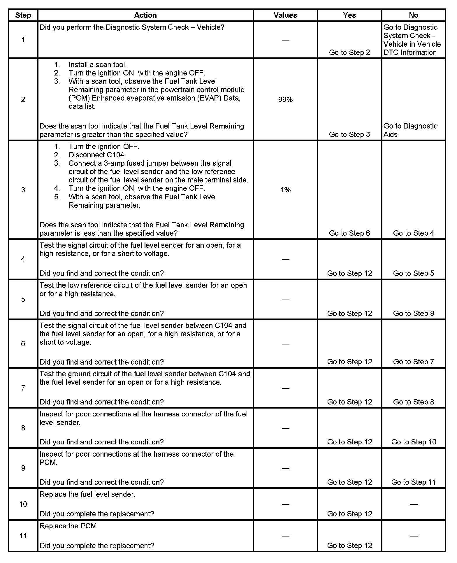 The fuel level sender changes resistance based on fuel level. The powertrain control module (PCM) monitors the signal circuit of the fuel level sender in order to determine fuel level. When the fuel tank is full, the sender resistance is high and the PCM senses a high signal voltage. When the fuel tank is empty, the sender resistance is low and the PCM senses a low signal voltage. The PCM uses the signal circuit of the fuel level sender in order to calculate the total remaining fuel percentage in the tank. The PCM sends the fuel level percent via the class 2 serial data circuit to the instrument cluster in order to control the fuel gage. The fuel level information is also used for misfire and evaporative emission (EVAP) diagnostics.