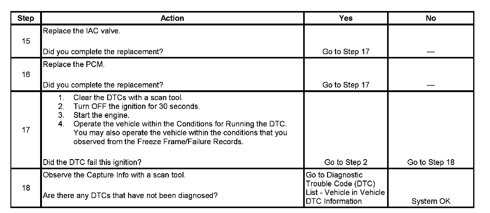 The engine idle speed is controlled by the idle air control (IAC) valve. The IAC valve is on the throttle body. The IAC valve pintle moves in and out of an idle air passage bore to control air flow around the throttle plate. The IAC valve consists of a movable pintle, driven by a gear attached to an electric motor called a stepper motor. The stepper motor is capable of highly accurate rotation, or of movement, called steps. The stepper motor has 2 separate windings that are called coils. Each coil is supplied current by 2 circuits from the powertrain control module (PCM). When the PCM changes polarity of a coil, the stepper motor moves one step. The PCM uses a predetermined number of counts to determine the IAC pintle position. Observe IAC counts with a scan tool. The IAC counts will increment up or down as the PCM attempts to change the IAC valve pintle position. An IAC Reset will occur when the ignition key is turned OFF. First, the PCM will seat the IAC pintle in the idle air passage bore. Second, the PCM will retract the pintle a predetermined number of counts to allow for efficient engine start-up. If the engine idle speed is out of range for a calibrated period of time, an idle speed diagnostic trouble code (DTC) sets.