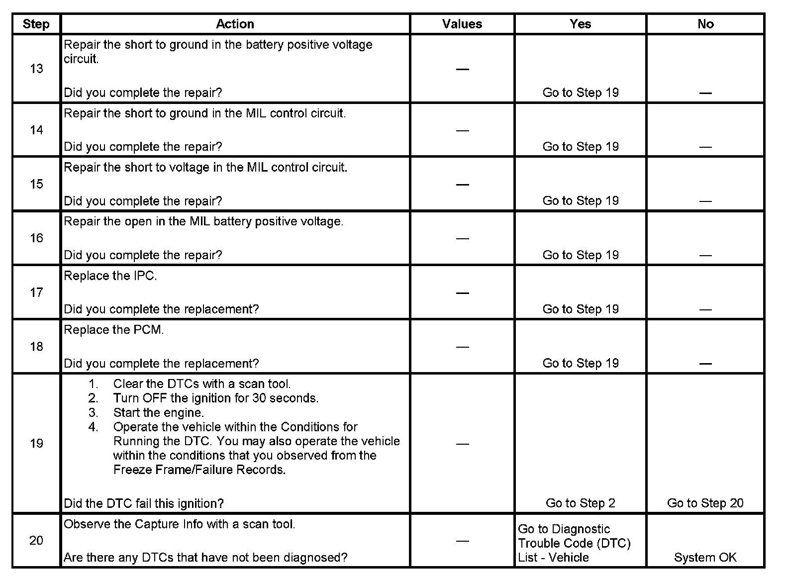 6. This step tests for a short to ground in the MIL control circuit. With the powertrain control module (PCM) disconnected and the ignition ON, the MIL should be OFF.