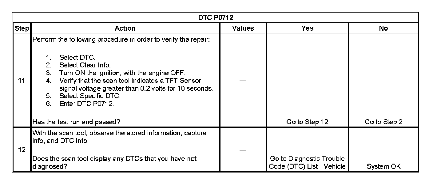 When the PCM detects a continuous short to ground in the TFT signal circuit or in the TFT sensor, then DTC P0712 sets. DTC P0712 is a type C DTC.