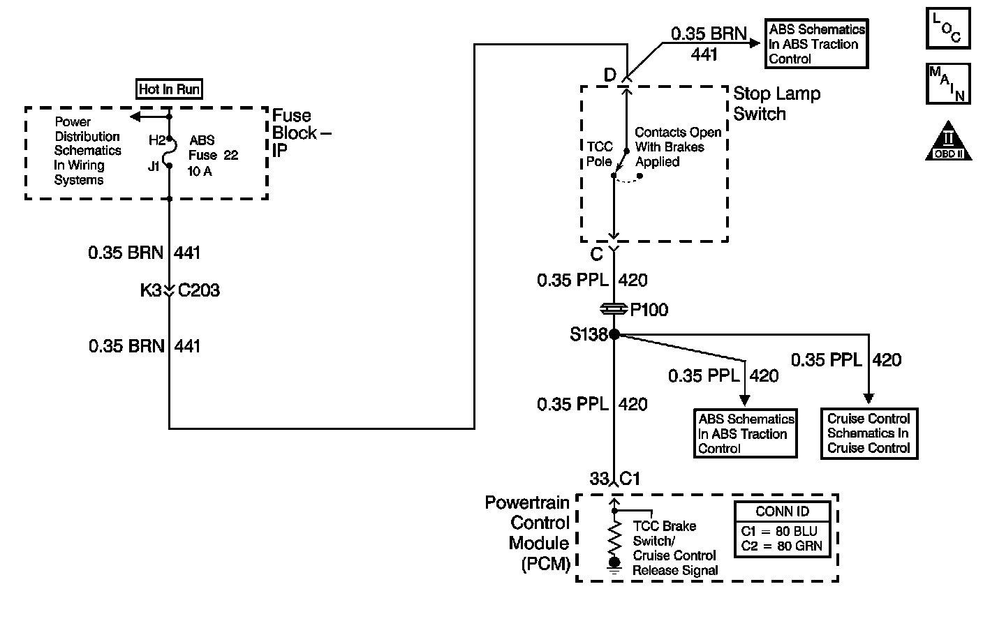 The brake switch indicates brake pedal status to the powertrain control module (PCM). The brake switch is a normally-closed switch that supplies battery voltage on the TCC brake switch signal circuit to the PCM. Applying the brake pedal opens the switch, interrupting voltage to the PCM. When the brake pedal is released, the PCM receives a constant voltage signal. If the PCM receives a zero voltage signal at the brake switch input, and the torque converter clutch (TCC) is engaged, the PCM de-energizes the TCC solenoid valve. The PCM disregards the brake switch input for TCC scheduling if there is a brake switch circuit fault.