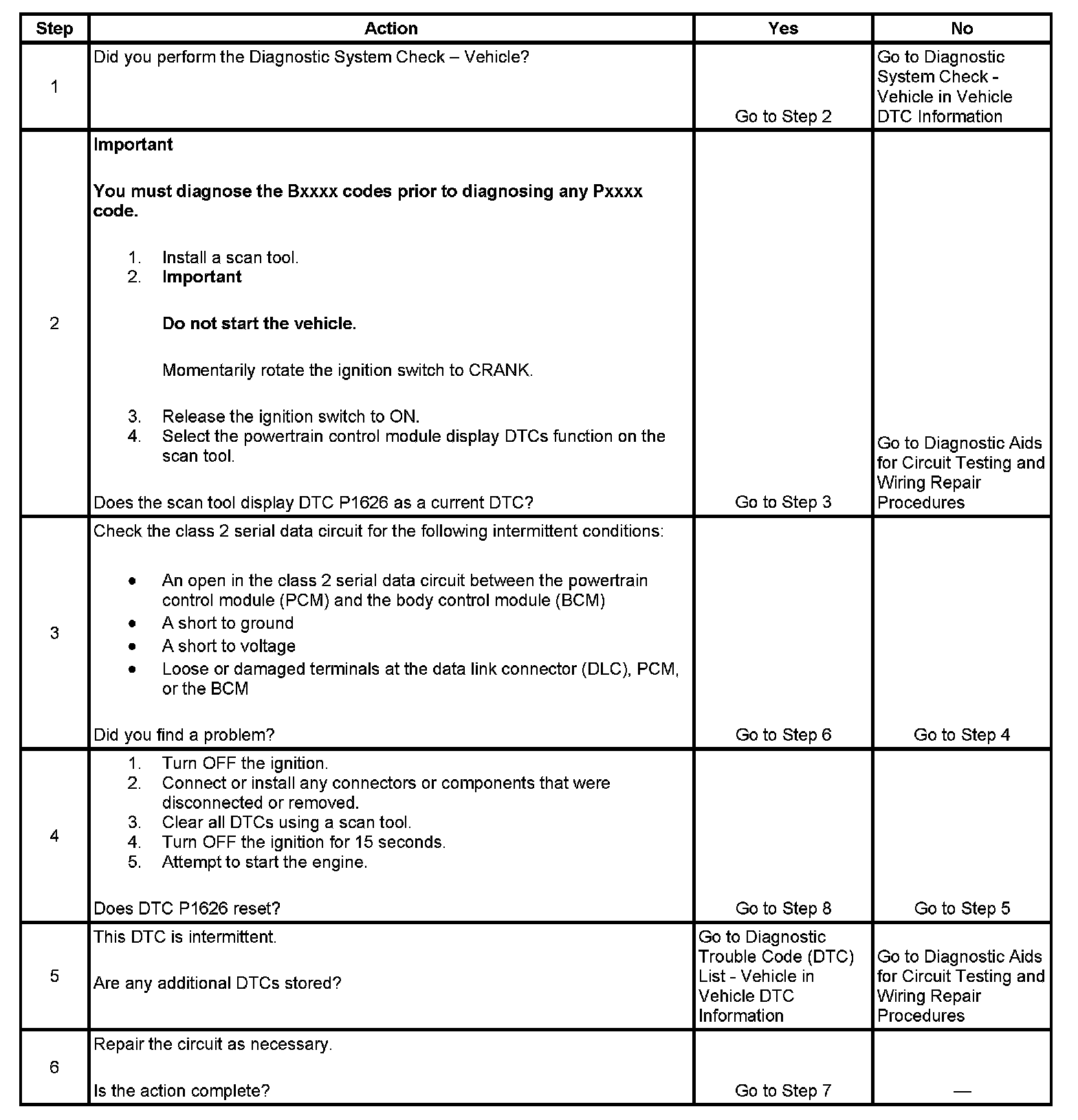 - If the class 2 serial data circuit is shorted to ground or shorted to voltage, then all systems connected to the serial data circuit will not be able to communicate properly. Systems capable of storing loss of communications DTCs, or the DTCs with the letter "U" as a prefix, will have these codes stored in their memory. If a DTC U1192 is stored in the PCM memory along with the P1626, then a fault occurred at some point after the PCM received the correct password. The BCM must also be inspected for intermittent operation due to a loss of power or ground to the module itself. After repairing the cause of DTC 1626, clear all DTCs from the systems capable of storing this DTC and DTC U1192.