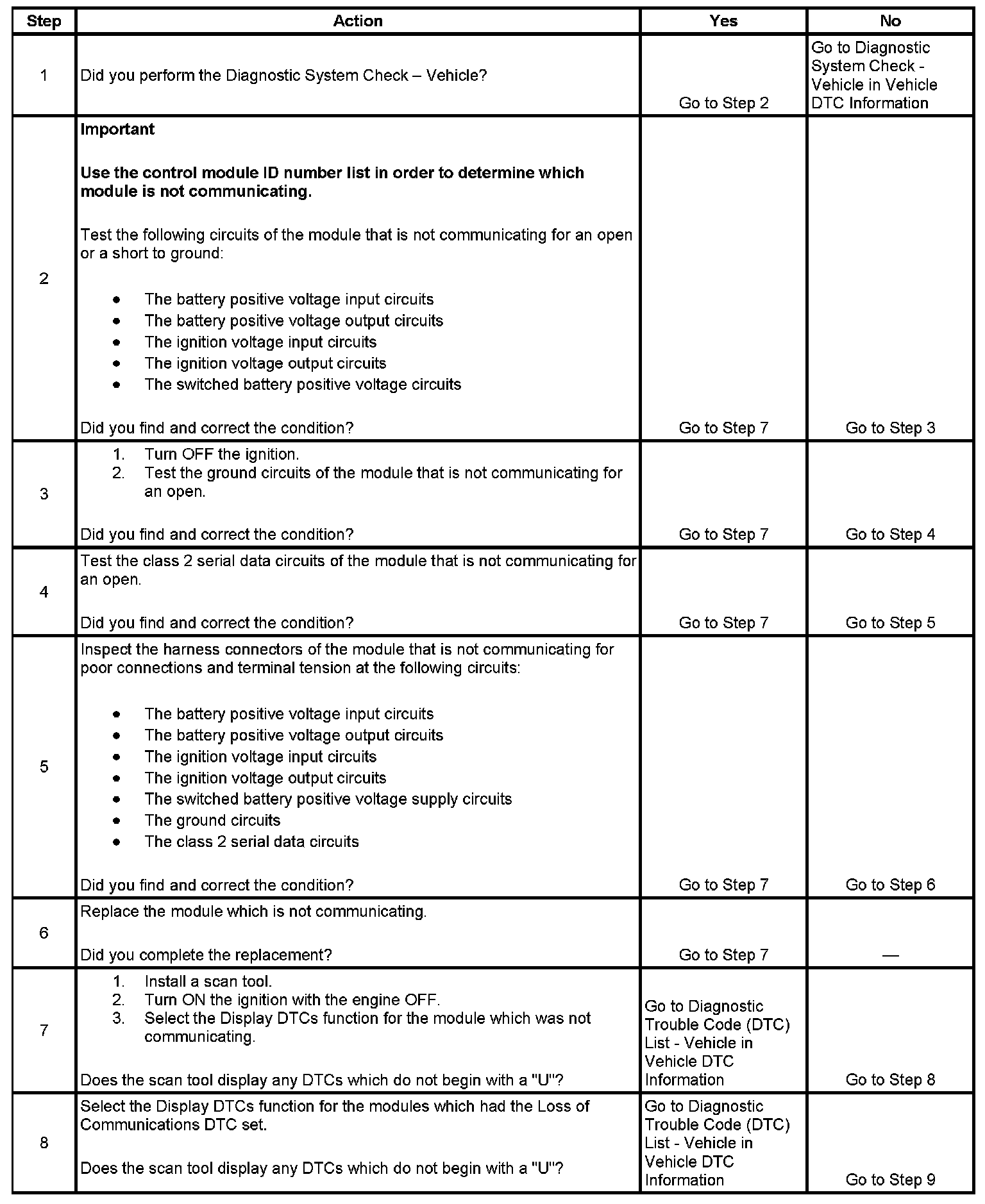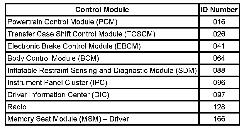 The control module ID number list provides a method for determining which module is not communicating. A module with a class 2 serial data circuit malfunction or which loses power during the current ignition cycle will have a Loss of Communication DTC set by other modules that depend on information from that failed module. The modules that can communicate will set a DTC indicating the module that can not communicate.