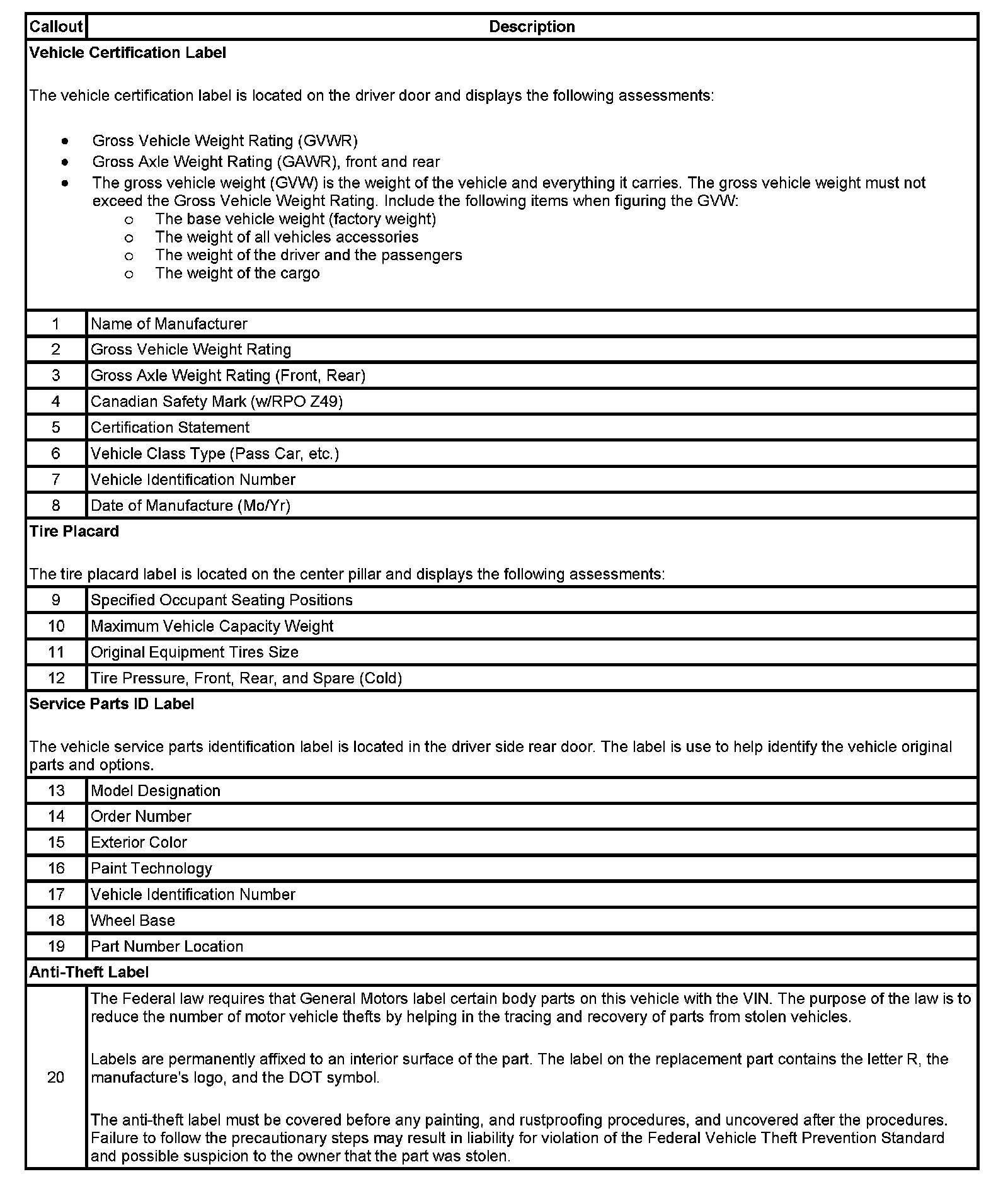 Label - Vehicle Certification, Tire Place Card, Anti-Theft And Service Parts ID: