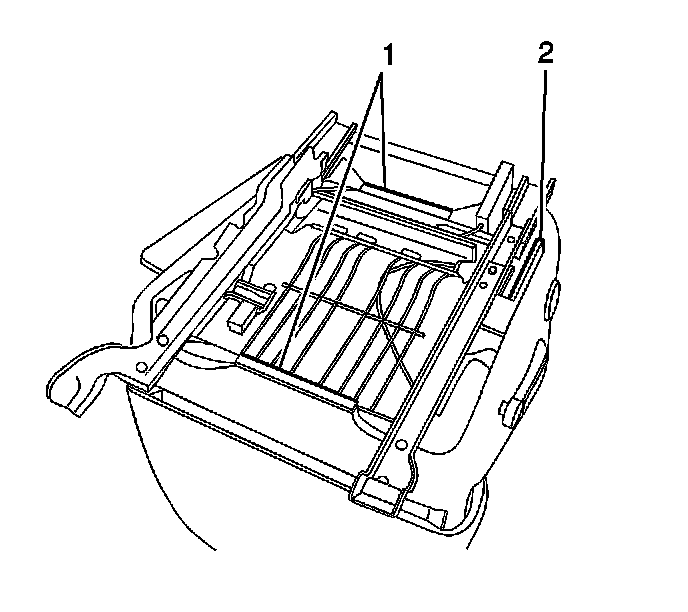 7. Remove the J-strips (1, 2) from to seat cushion frame.