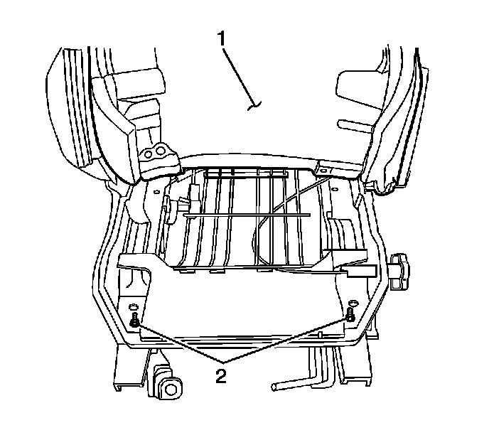 10. Pull the seat cover and cushion (1) up to expose the 4 seat frame mounting nuts (2).