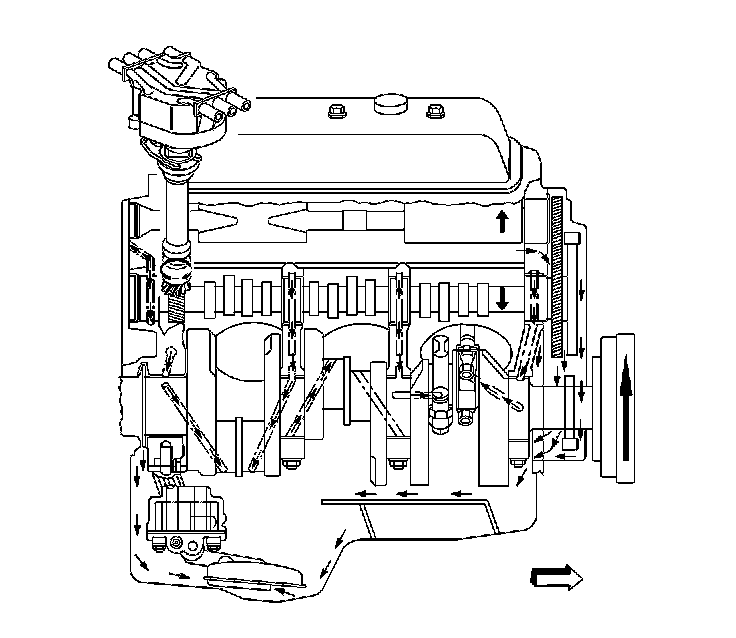 Full pressure lubrication, through a full-flow oil filter is supplied by a gear-type oil pump. Oil is drawn up through the oil pump screen and passes through the pump to the oil filter. The oil filter is a full-flow paper element unit with an anti-drain back valve. An oil filter bypass valve is used to ensure adequate oil supply, in the event the filter becomes plugged or develops excessive pressure drop. Filtered oil flows into the main gallery and then to the camshaft, the balance shaft, the rear bearing, and the crankshaft bearings. The valve lifter oil gallery supplies oil to the valve lifters. Oil flows from the valve lifters through the hollow valve pushrods to the valve rocker arms. Oil drains back to the crankcase through the oil drain holes in the cylinder head. The camshaft timing chain is drip fed from the front camshaft bearing. The pistons and piston pins are lubricated by oil splash.