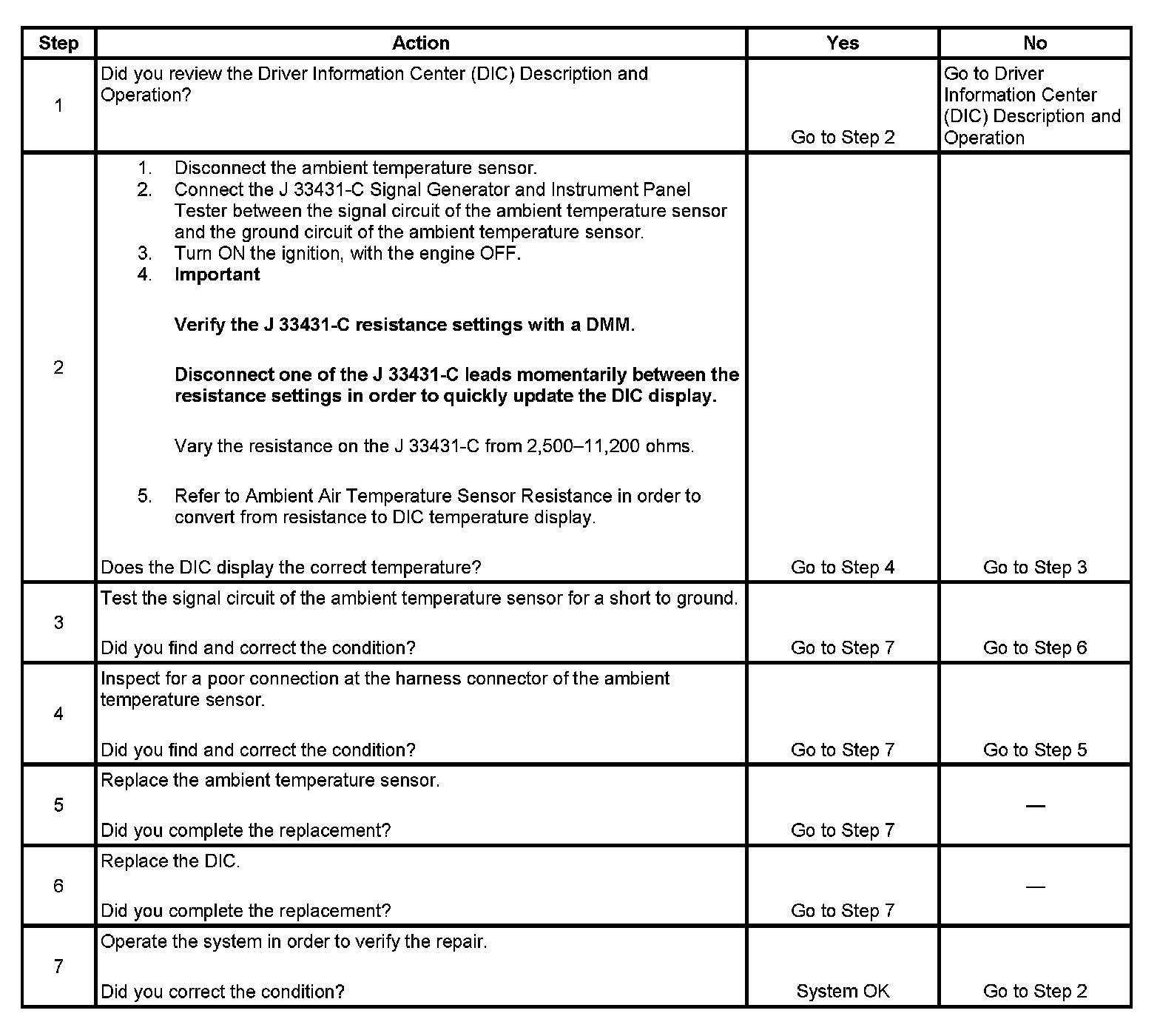 - Refer to Ambient Air Temperature Sensor Resistance in order to verify the correct ambient temperature sensor readings.