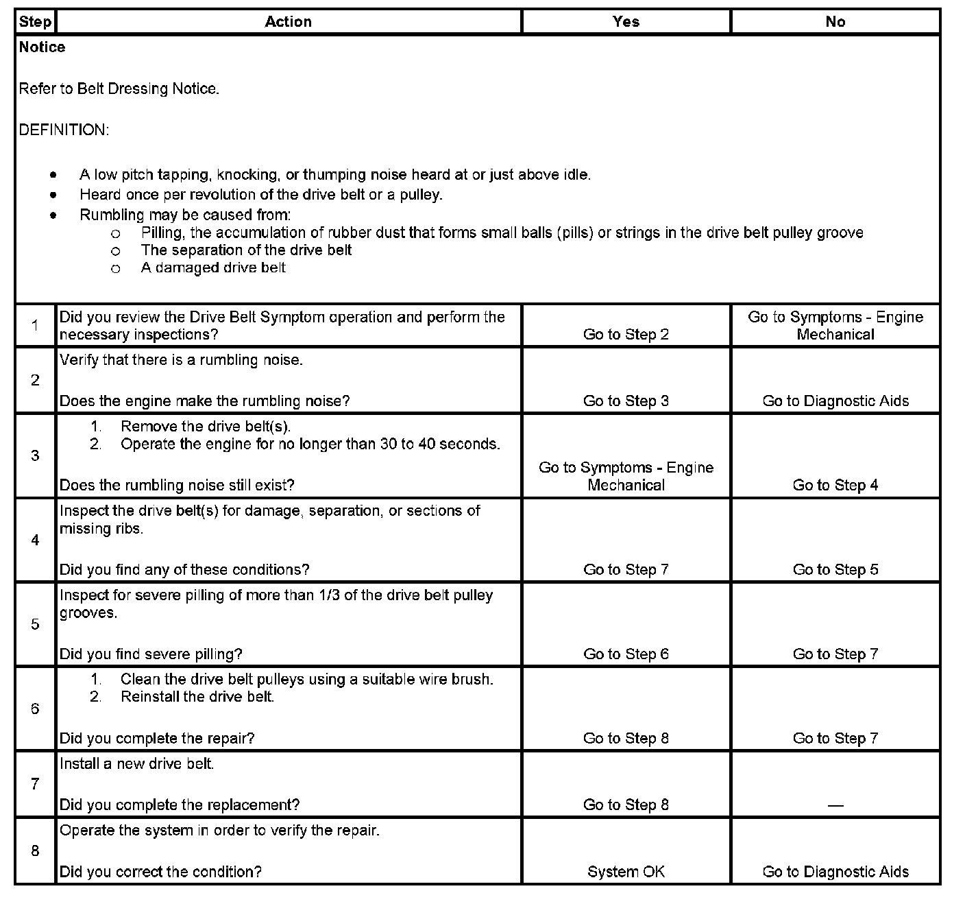 3. This test is to verify that the drive belt(s) is causing the rumbling noise. Rumbling noise may be confused with an internal engine noise due to the similarity in the description. Remove only one drive belt at a time if the vehicle has multiple drive belts. When removing the drive belt the water pump may not be operating and the engine may overheat. Also DTCs may set when the engine is operating with the drive belt removed.