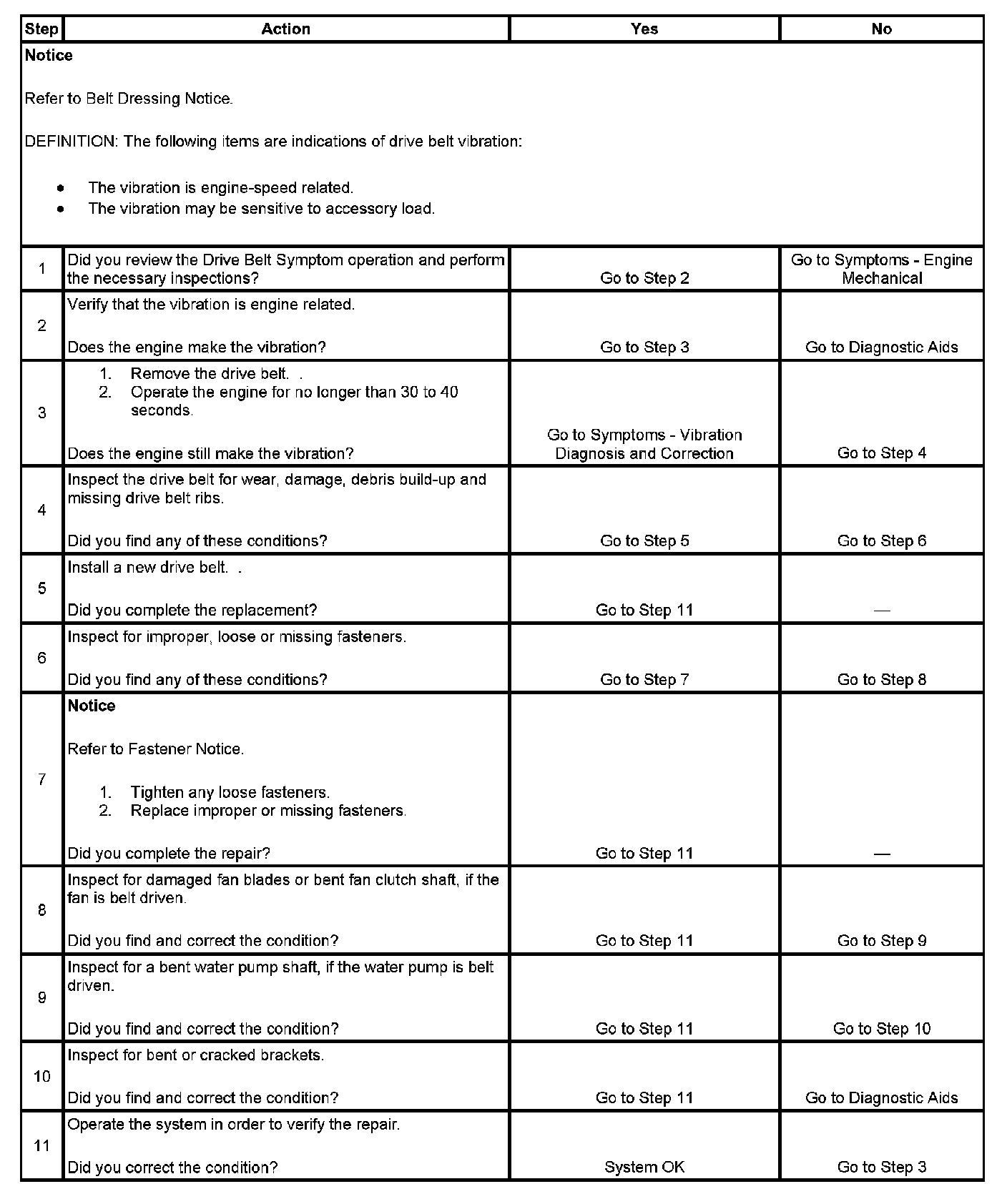 3. This test is to verify that the drive belt(s) or accessory drive components may be causing the vibration. When removing the drive belt the water pump may not be operating and the engine may overheat. Also DTCs may set when the engine is operating with the drive belt removed.
