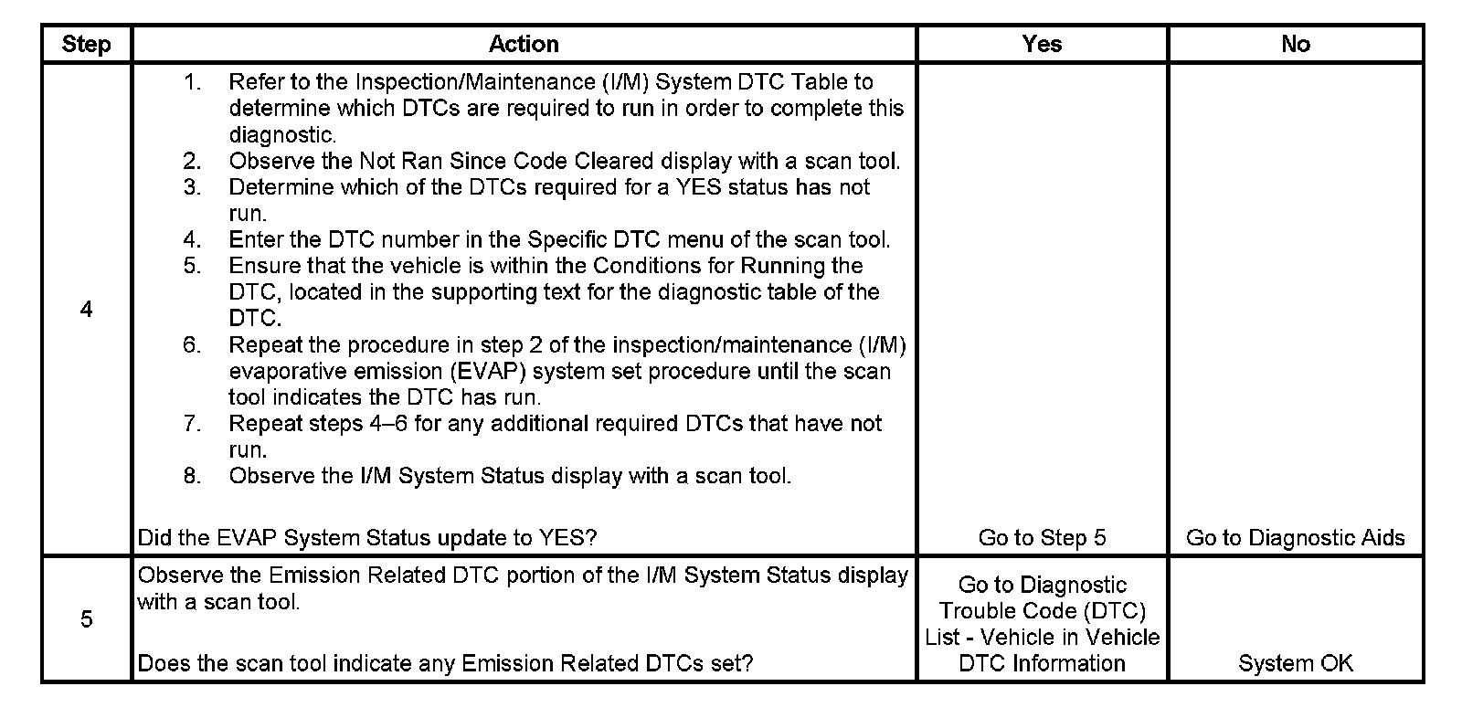 The purpose of this procedure is to satisfy the enable criteria necessary to execute inspection/maintenance (I/M) readiness diagnostics for the Evaporative Emission (EVAP) System. The procedure may be used to set the EVAP I/M System Status display on the scan tool to YES. The EVAP I/M System Status display indicates whether or not the control module has completed the readiness diagnostics. The readiness diagnostics complete when all DTCs comprising the diagnostics run and pass, or any DTC comprising the diagnostics illuminates the malfunction indicator lamp (MIL). If the diagnostics pass during one drive cycle, seventeen hours must elapse, regardless of whether the vehicle is driven or not. Then, the diagnostics will run again during the next drive cycle in which the conditions for running are met. Once the diagnostics have passed during the third drive cycle, the EVAP I/M System Status display will be updated to YES. A failed or aborted diagnostic will require the vehicle to cool down in order to meet the enable criteria for another drive cycle. Therefore, performing a visual inspection prior to running the EVAP test may prevent having to repeat the drive cycle.