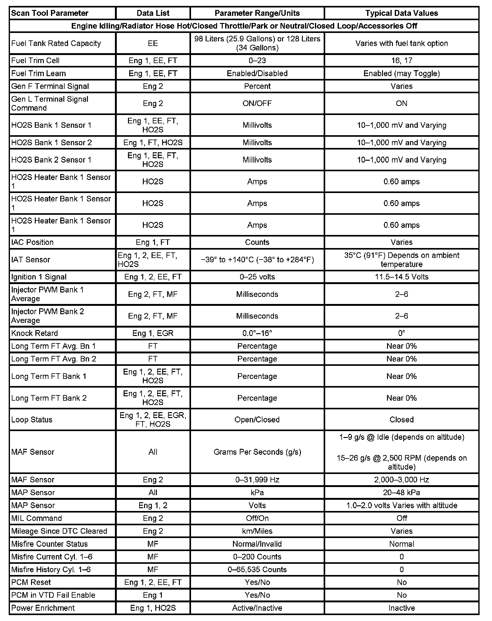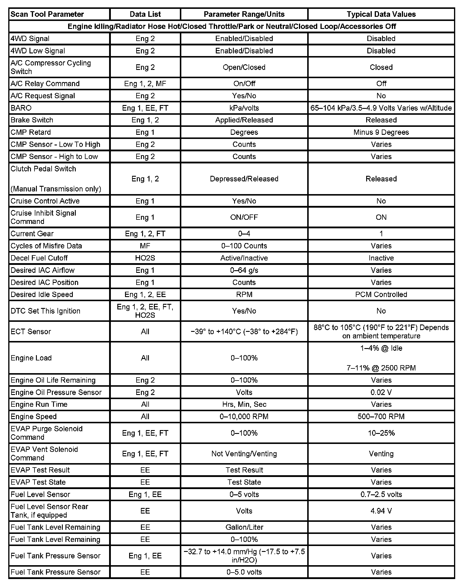 The Engine Scan Tool Data List contains all engine related parameters that are available on the scan tool. The list is arranged in alphabetical order. A given parameter may appear in any one of the data lists, and in some cases may appear more than once, or in more than one data list in order to group certain related parameters together.
