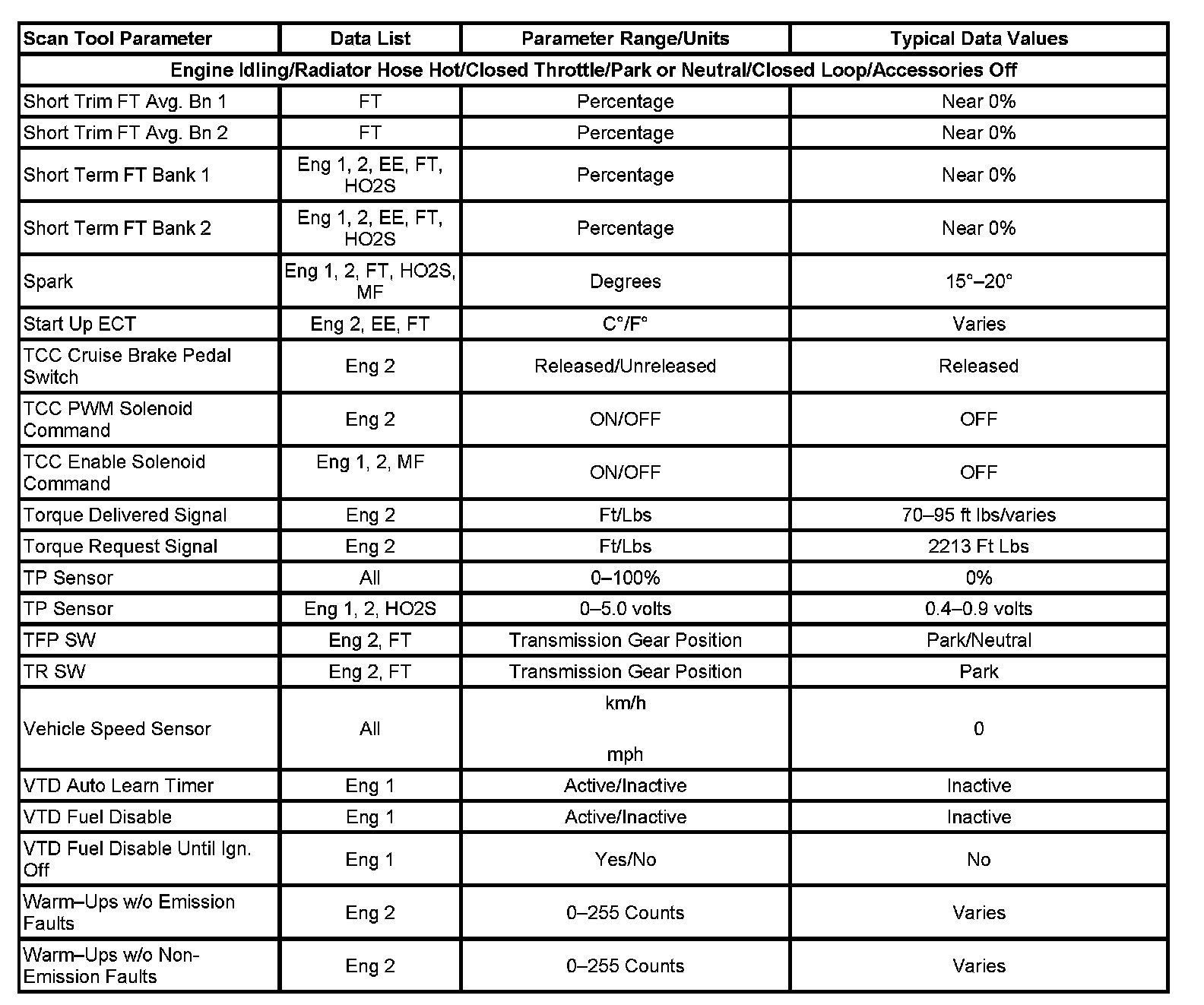 Scan tool values from a properly running engine may be used for comparison with the engine you are diagnosing. The Engine Scan Tool Data List represents values that would be seen on a normal running engine.
