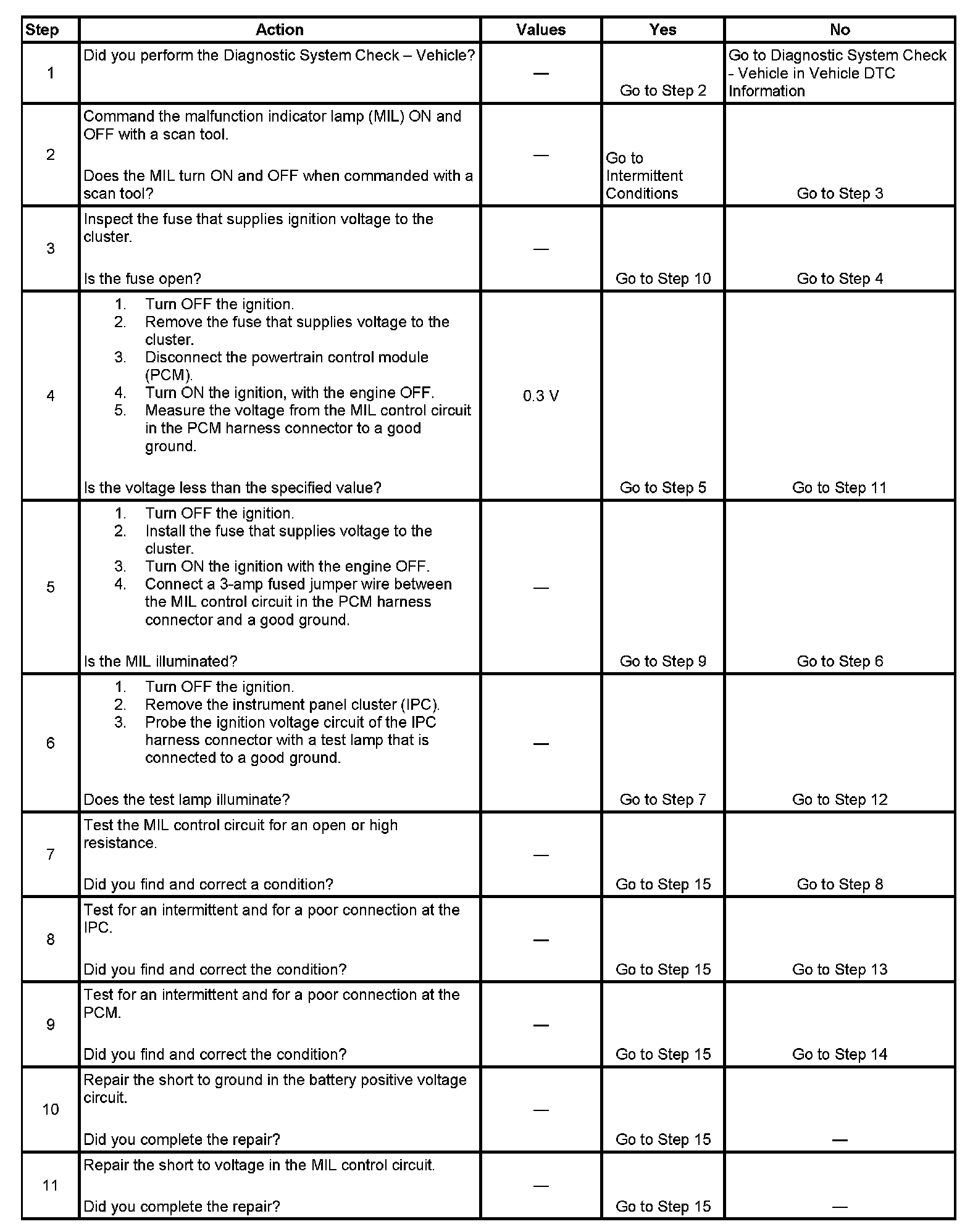 Ignition voltage is supplied to the malfunction indicator lamp (MIL). The powertrain control module (PCM) turns the MIL ON by grounding the MIL control circuit. There should be a steady MIL with the ignition ON and the engine OFF.