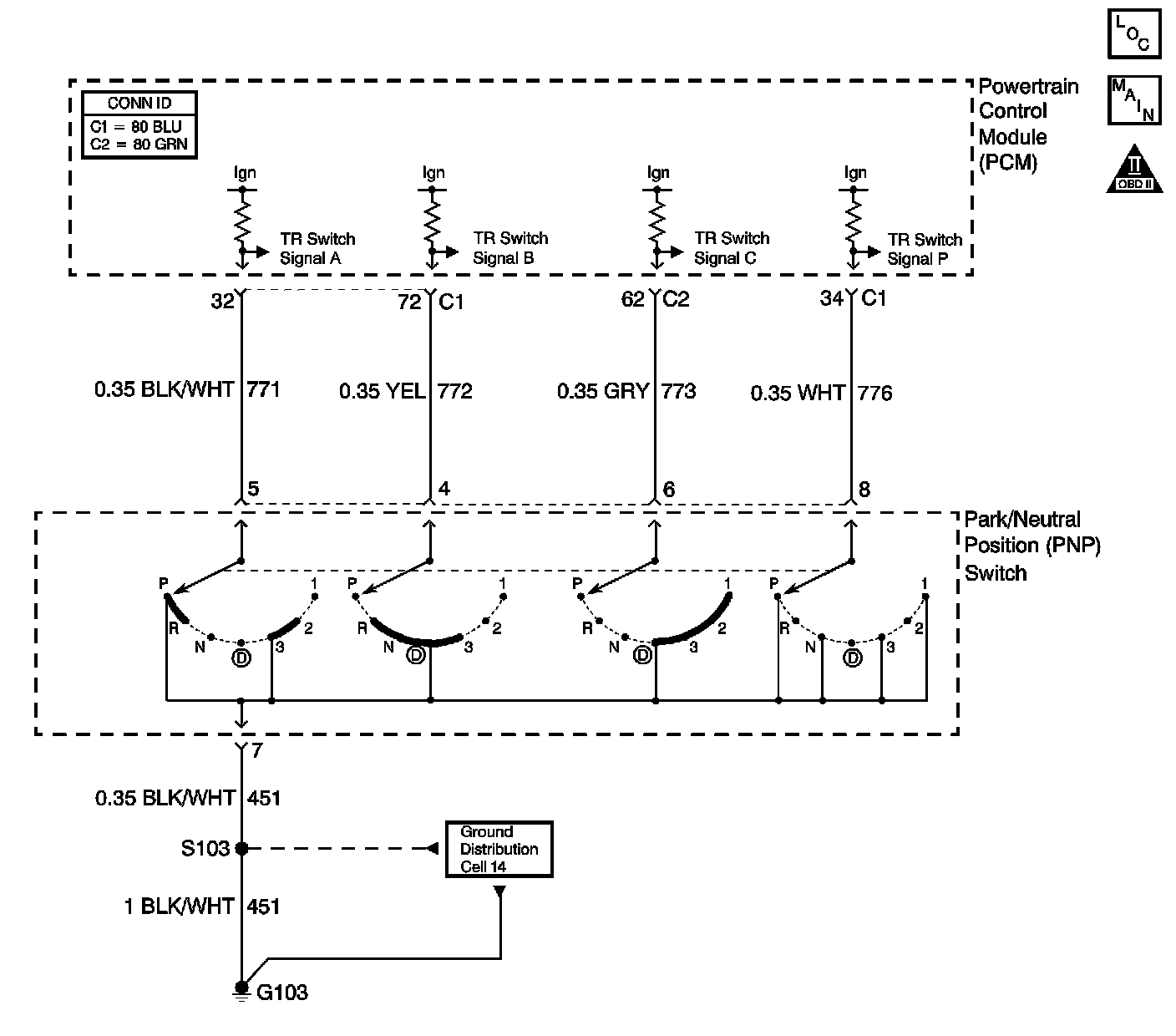 Refer to the Transmission Range Switch Logic table for valid combinations of switch signal circuits A, B, C and Parity. On the table, HI indicates an ignition voltage signal. LOW indicates a zero voltage signal.