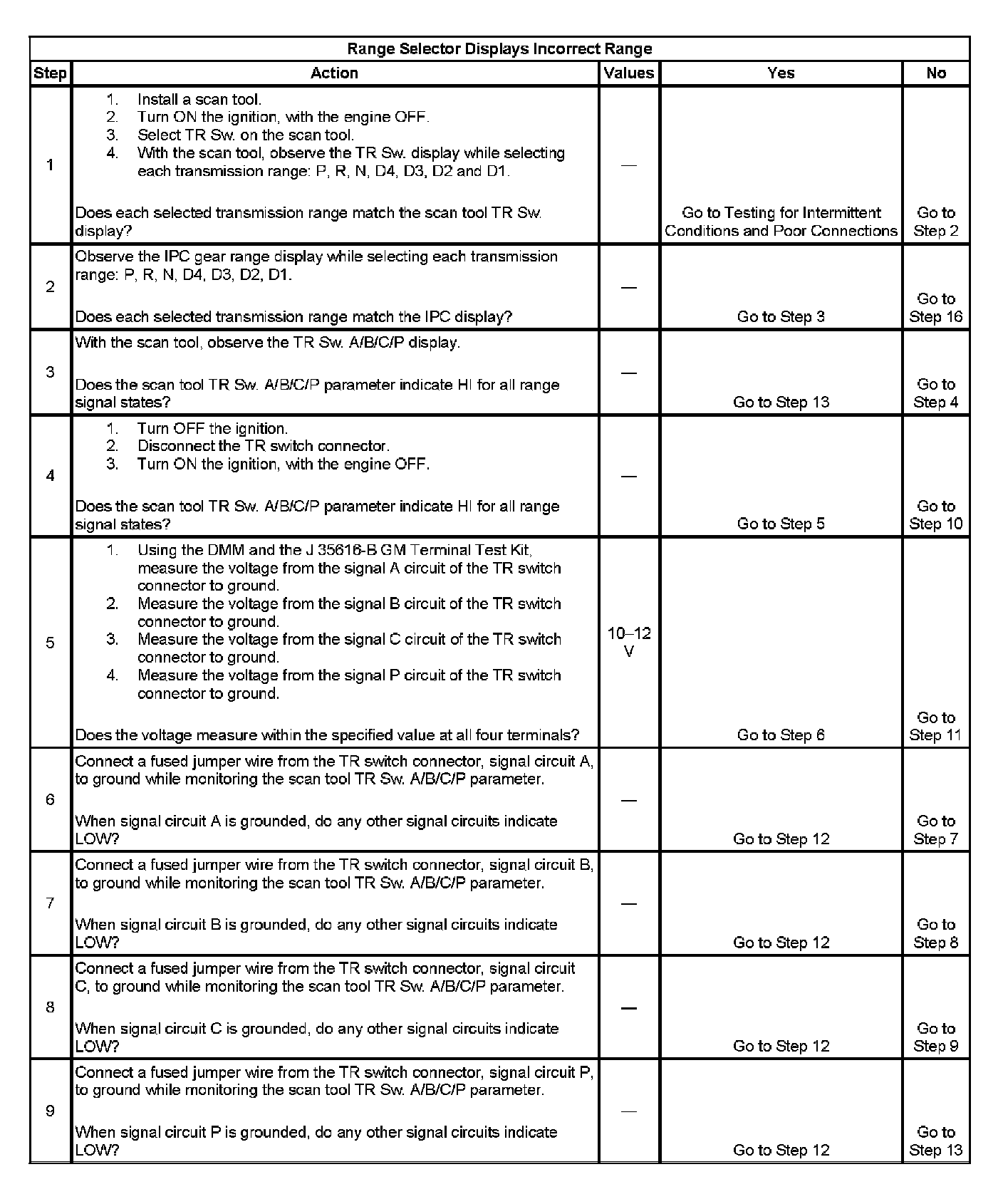 9. This step tests the TR switch wiring and the PCM by providing a ground path through a fused jumper wire. When grounded, the scan tool range signal states should change to LOW.