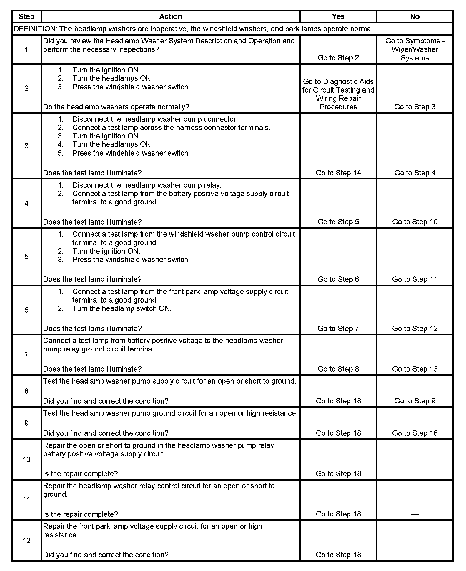 5. Tests the washer pump control circuit to the headlamp washer pump relay.