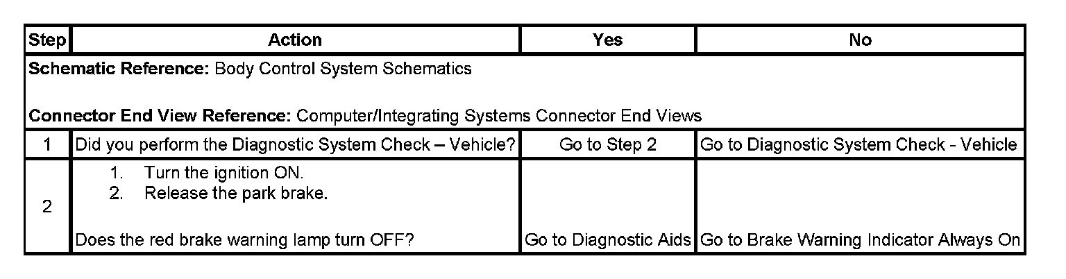 The body control module (BCM) monitors the status of the park brake. When the BCM receives a ground input from the park brake switch, a serial data message is sent to the instrument panel cluster (IPC) requesting illumination of the red brake warning indicator.