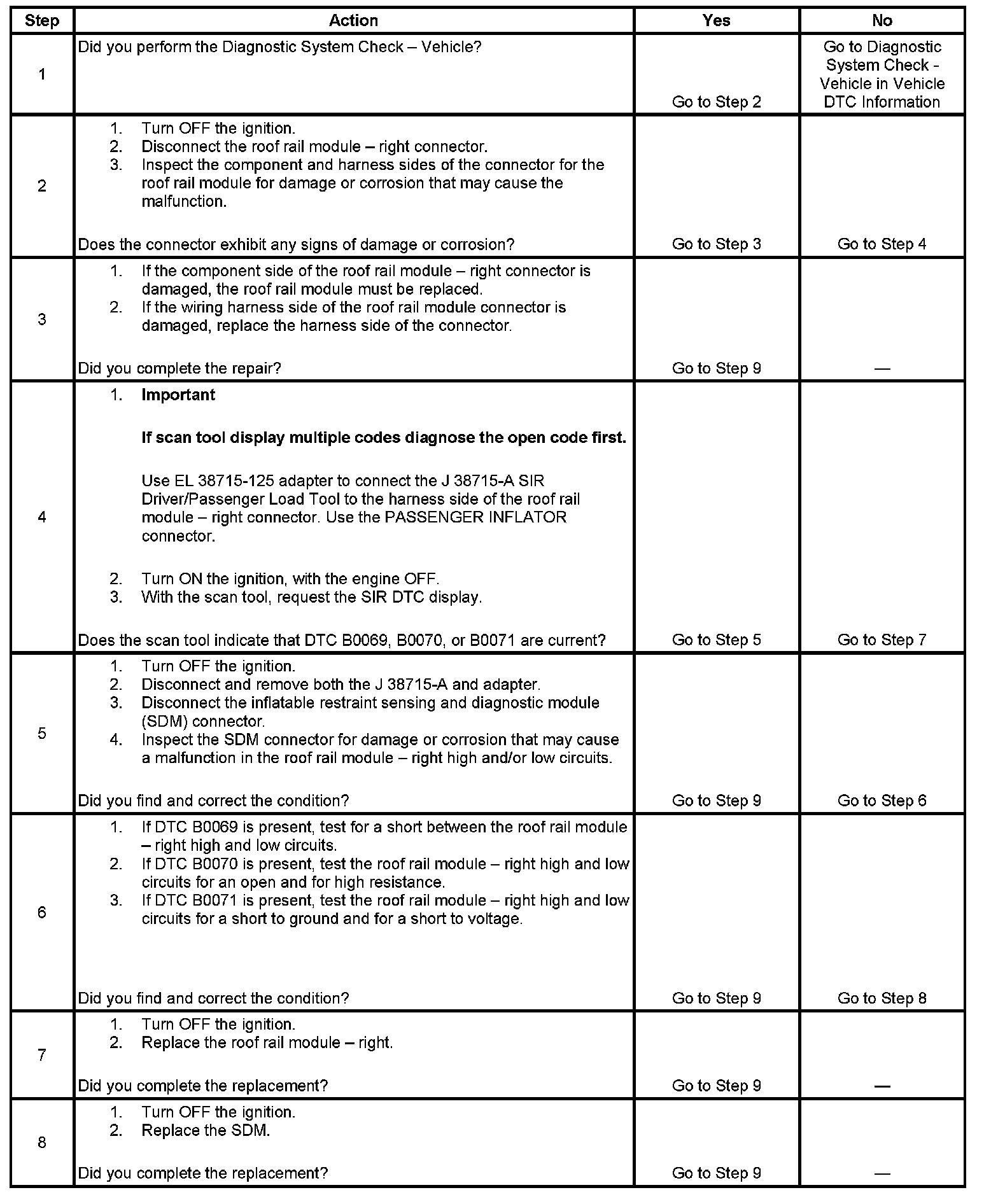 6. Tests to see what DTCs are present. If DTC B0069 is present, test for a short between the roof rail module - right high and low circuits. If DTC B0070 is present, test the roof rail module - right high and low circuits for an open and for high resistance. If DTC B0071 is present, test the roof rail module - right high and low circuits for a short to ground and for a short to voltage.