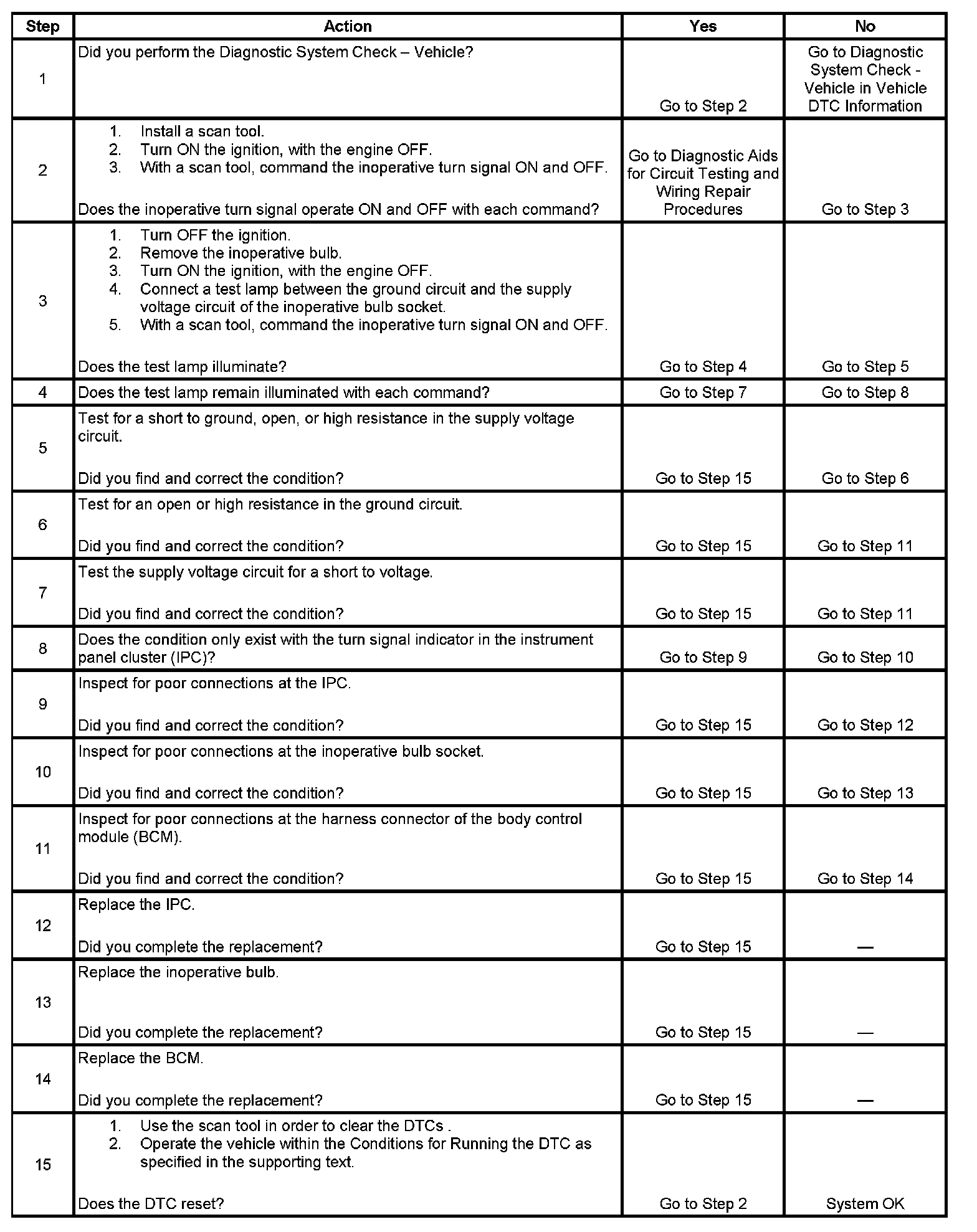 - When the BCM receives a right turn signal command and the right rear stop/turn lamp supply voltage circuit is open, shorted to ground, or shorted to voltage