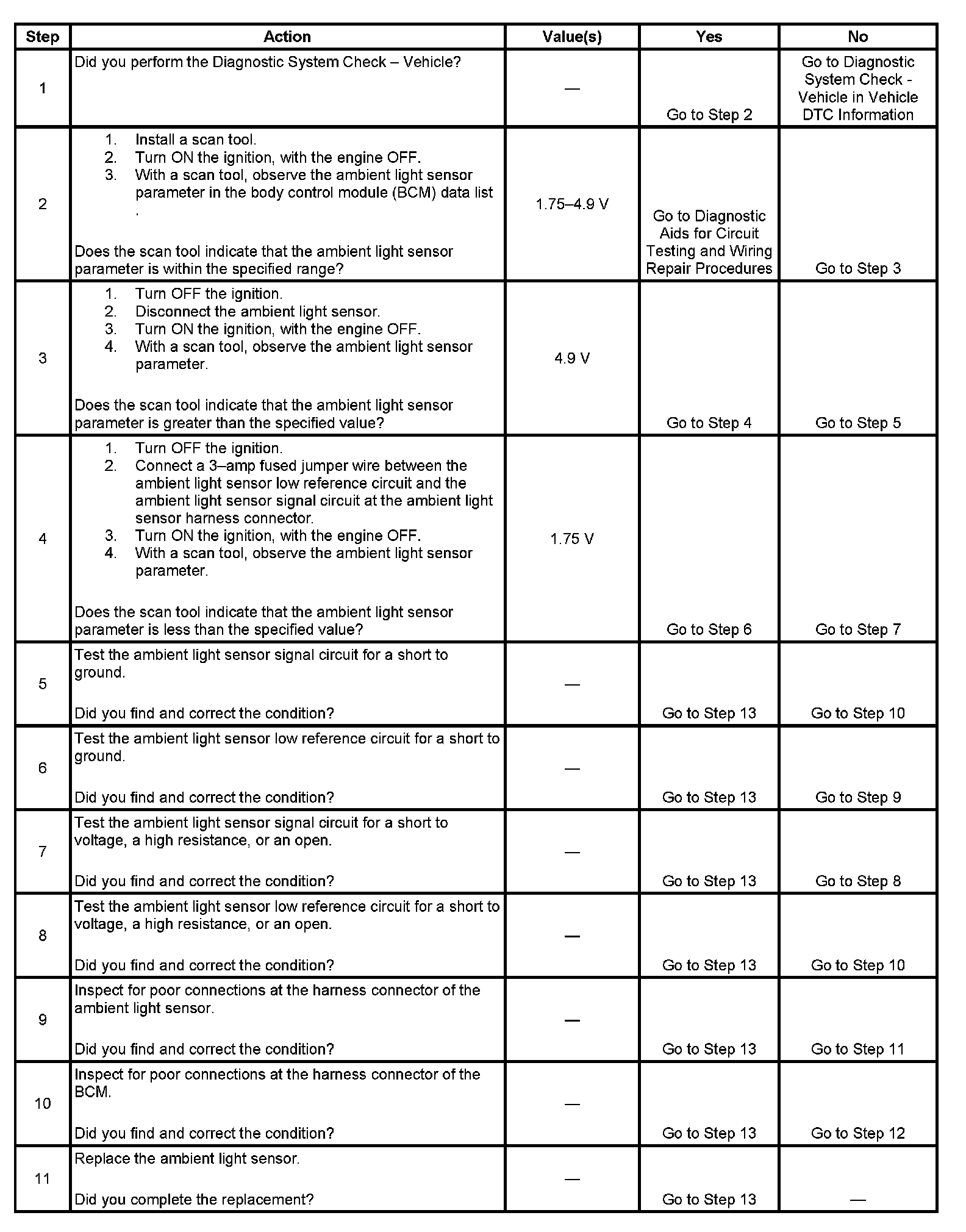 The body control module (BCM) monitors the ambient light sensor signal circuit in order to determine if the daytime running lights (DRL) or the auto headlights (ALC) should be turned ON in the AUTO mode. When the BCM senses the ambient light sensor signal voltage is between 1.75-4.9 volts, either the DRL will be commanded ON or the ALC will be commanded ON depending upon the amount of light received by the sensor.