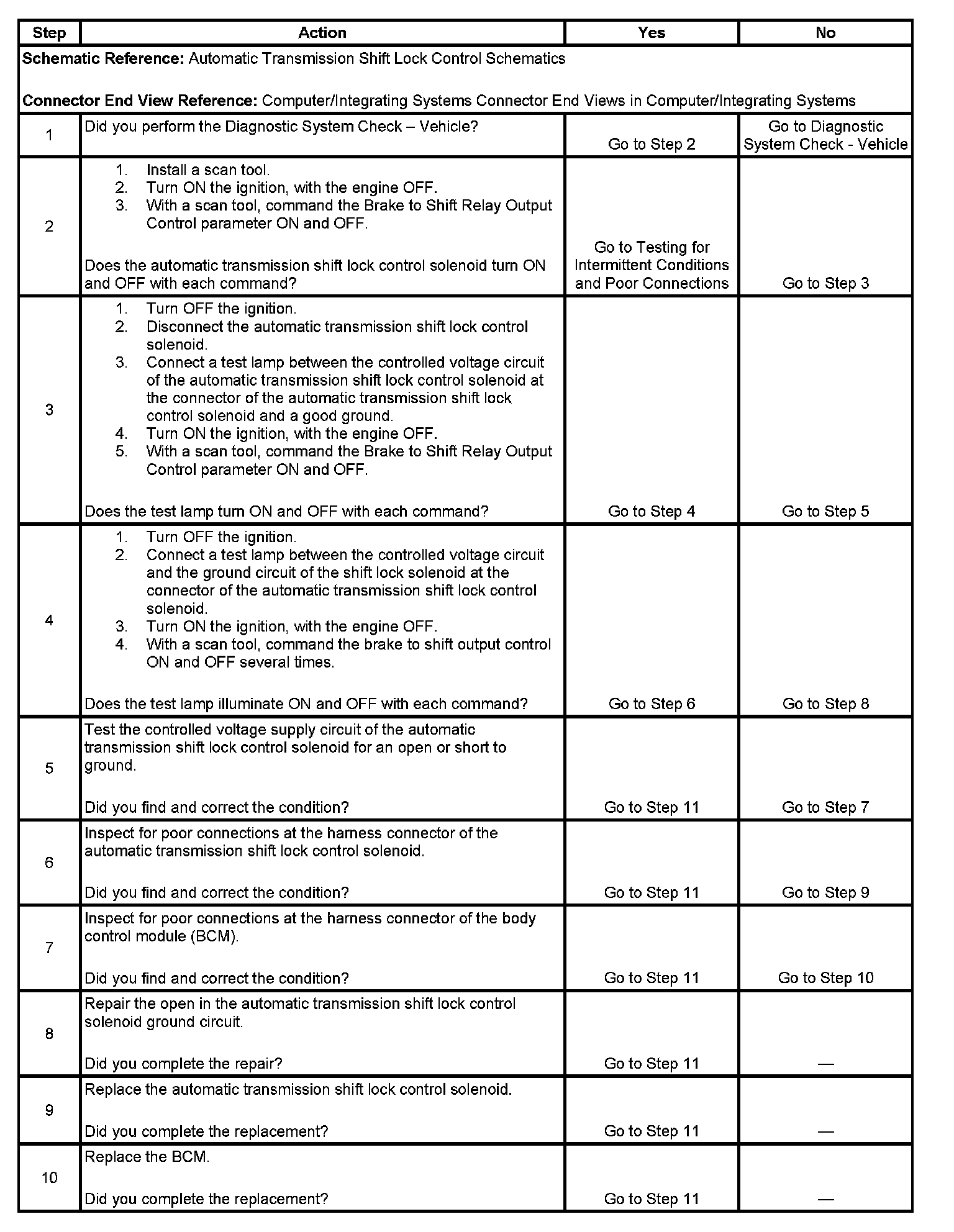 4. Tests for ground at the control circuit of the automatic transmission shift lock control solenoid.