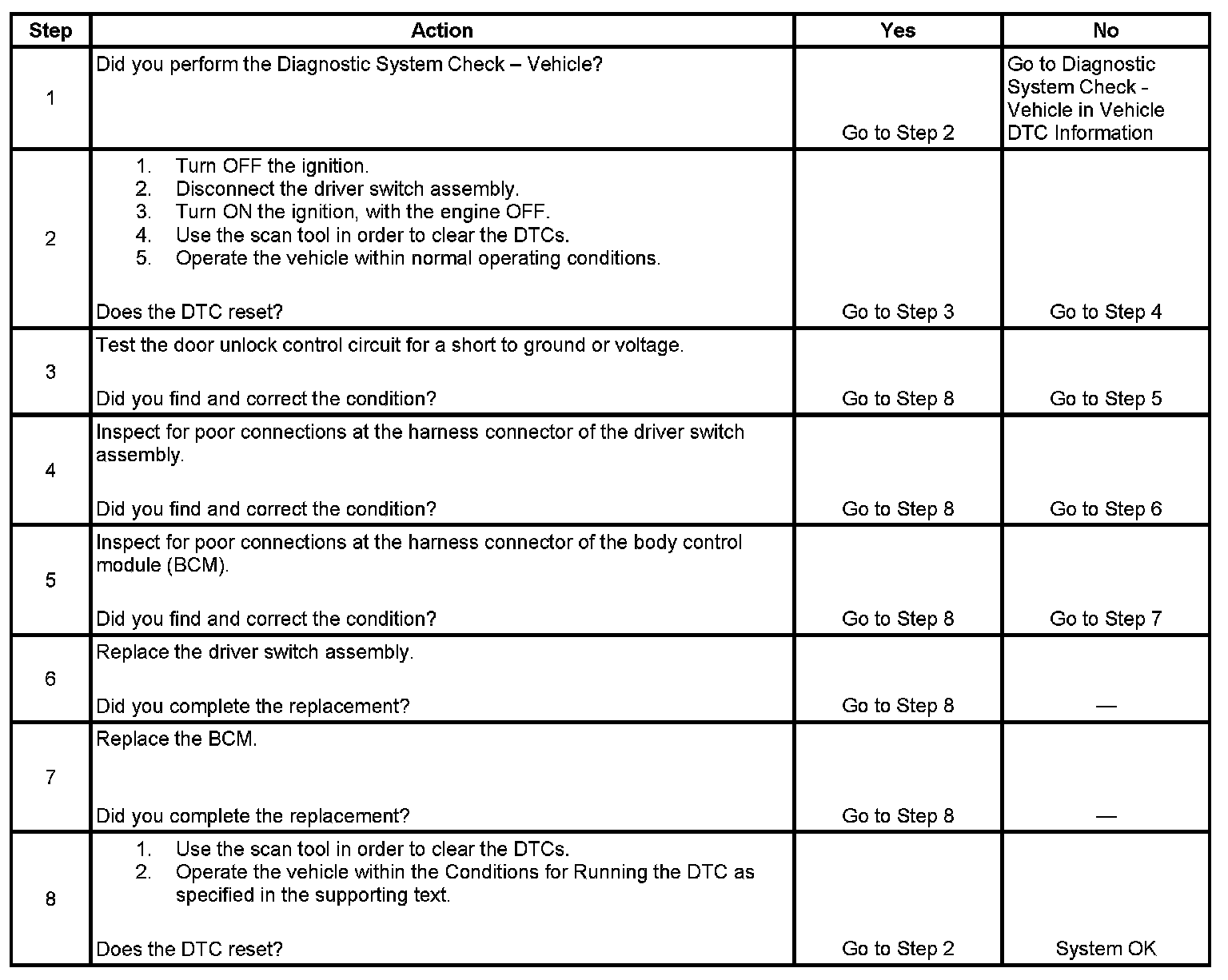 - The BCM no longer detects the short to ground on the door unlock control circuit for greater than 60 seconds.
