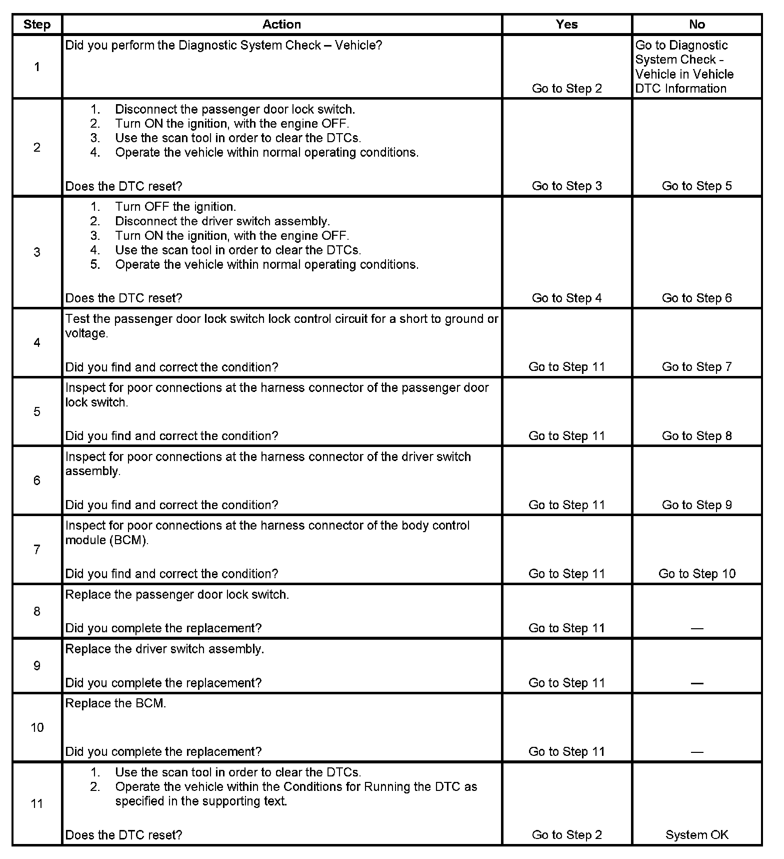 - The BCM no longer detects the short to battery on the passenger door lock switch lock control circuit for greater than 1 second.