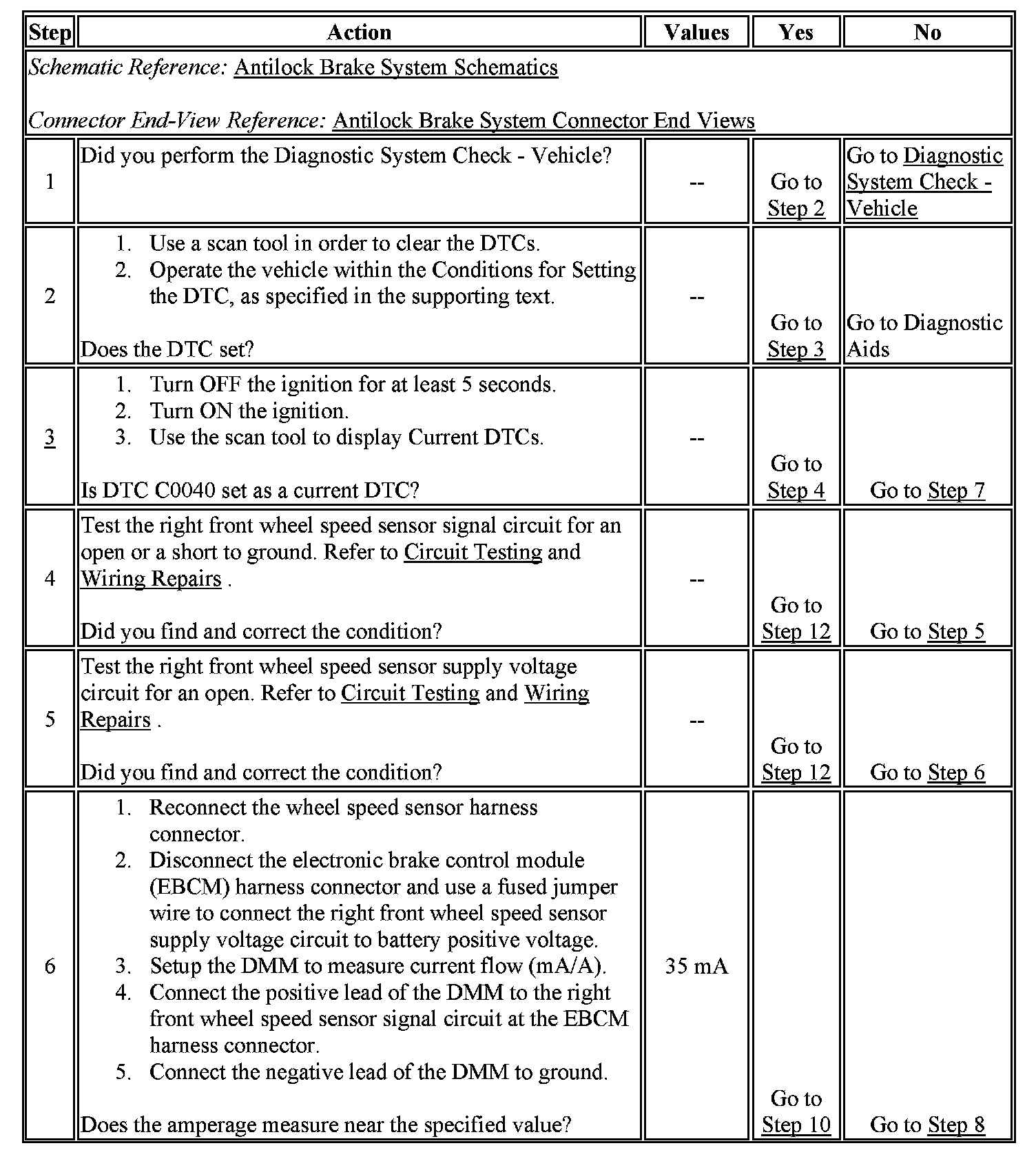 3. If the DTC sets when the vehicle is not moving, the EBCM is detecting an open or shorted wheel speed sensor or wheel speed sensor circuit.