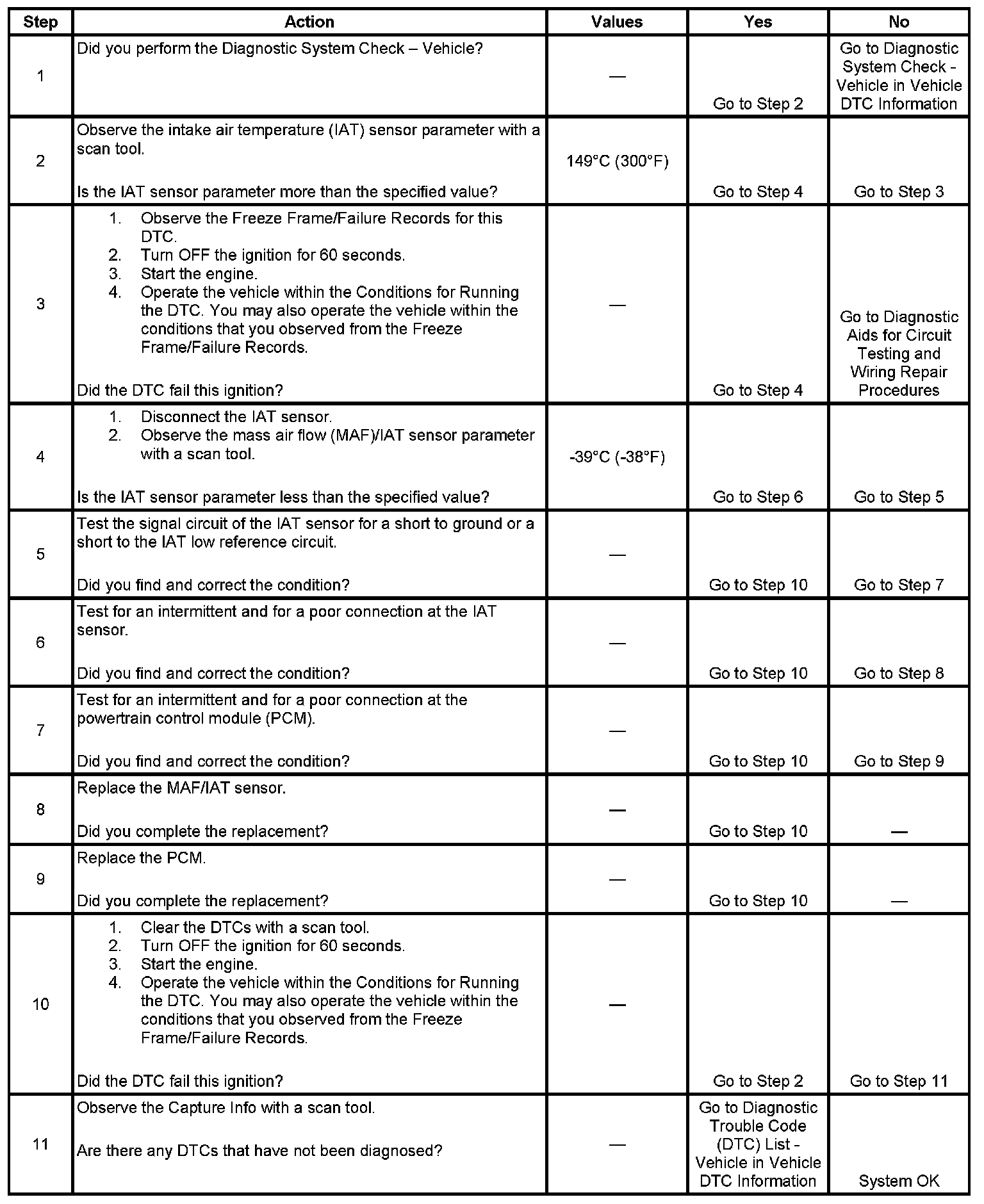 The PCM detects that the IAT sensor parameter is more than 149°C (300°F) for more than 5 seconds.