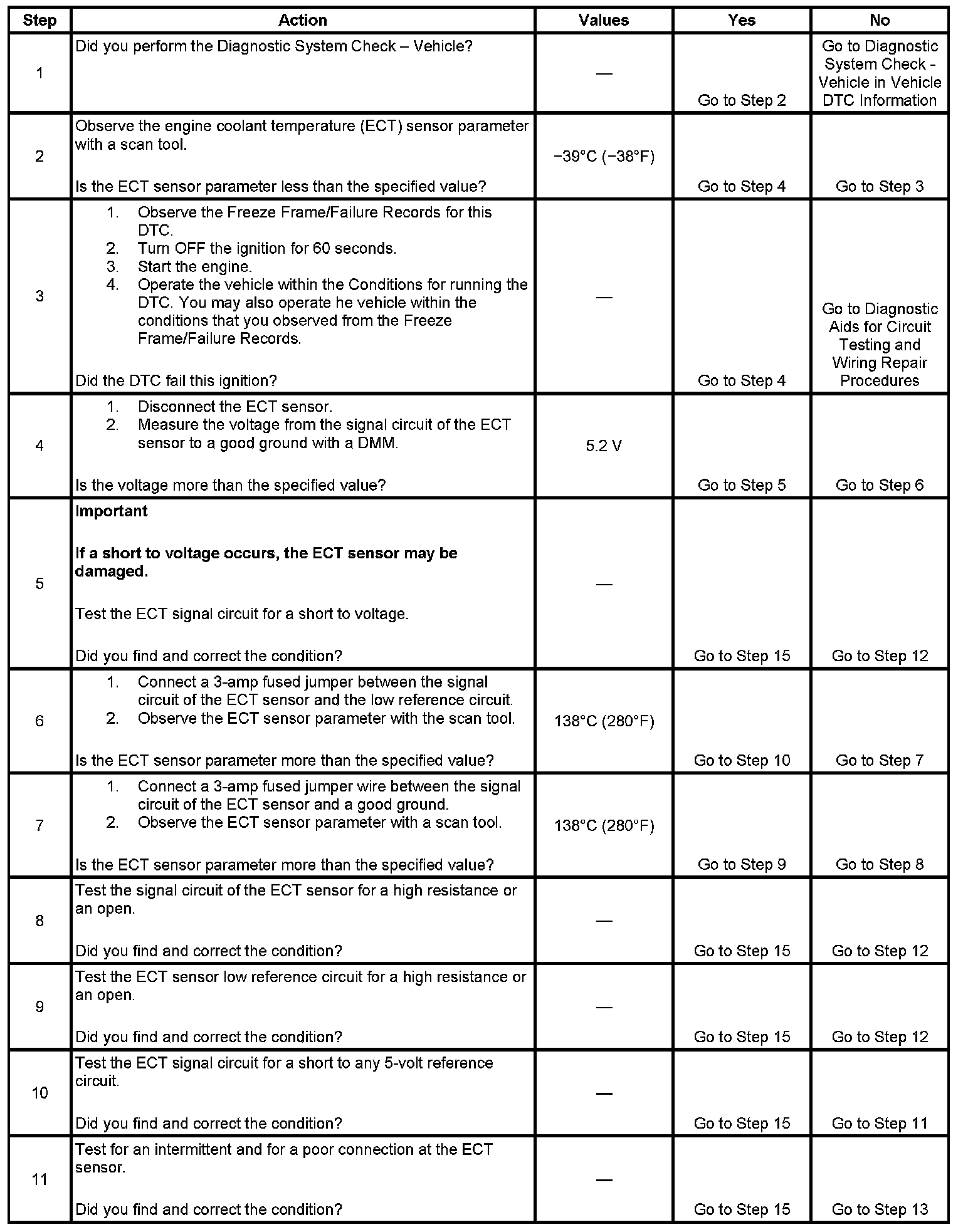 The engine coolant temperature (ECT) sensor is a variable resistor, that measures the temperature of the engine coolant. The ECT sensor has a signal circuit and a low reference circuit. The powertrain control module (PCM) supplies 5 volts to the ECT signal circuit and a ground for the ECT low reference circuit. When the ECT is cold, the sensor resistance is high. When the ECT increases, the sensor resistance decreases. With high sensor resistance, the PCM detects a high voltage on the ECT signal circuit. With lower sensor resistance, the PCM detects a lower voltage on the ECT signal circuit. If the PCM detects an excessively high ECT signal voltage, which is a low temperature indication, DTC P0118 sets.