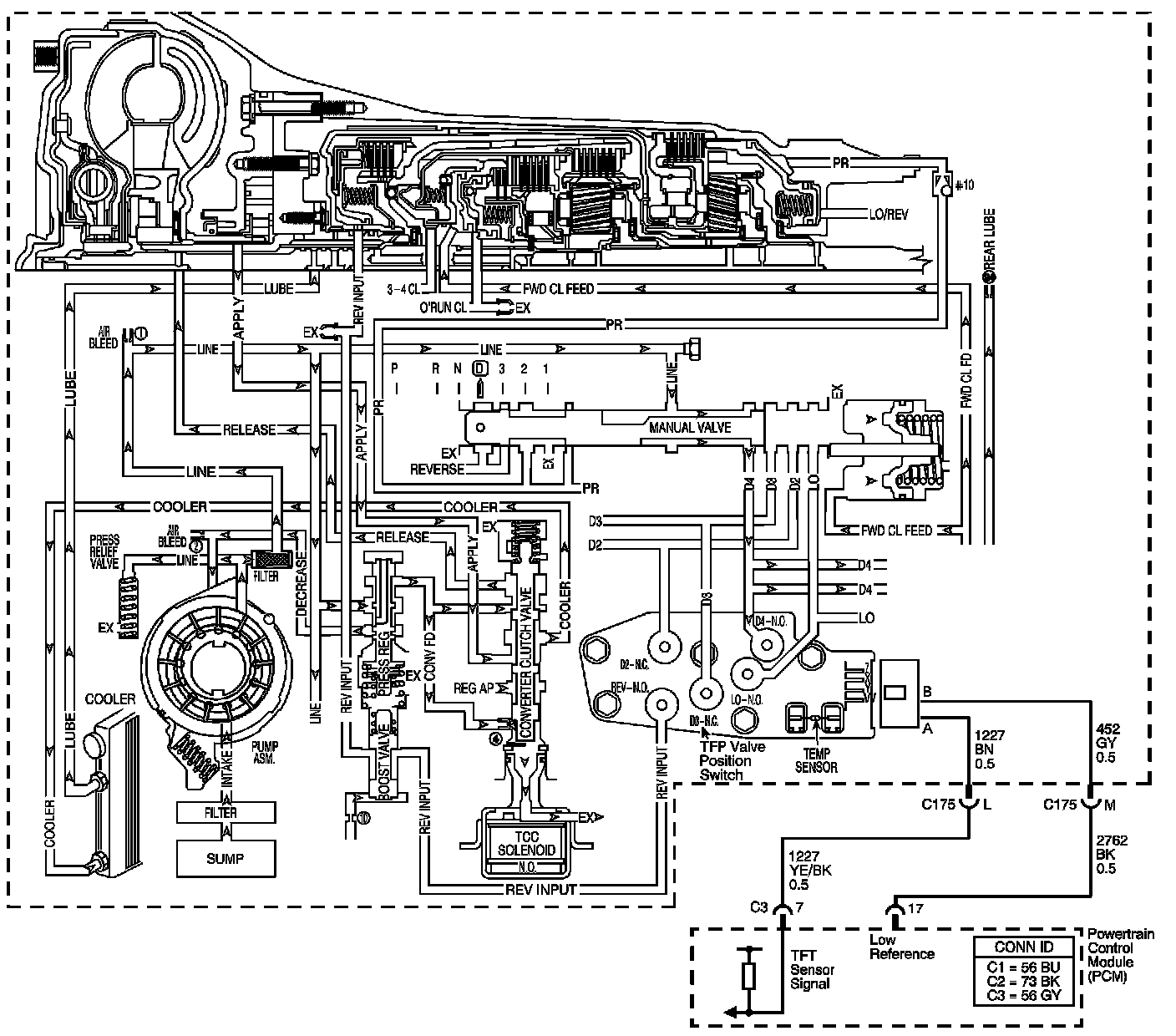 The flow of transmission fluid starts in the bottom pan and is drawn through the filter, control valve body assembly, transmission case and into the oil pump assembly. The oil pump assembly pressurizes the fluid and directs it to the pressure regulator valve where it becomes the main supply of fluid to the various components and hydraulic circuits in the transmission. Hot fluid exiting the torque converter flows through the converter clutch apply valve and into the transmission cooler lines to the oil cooler located in the vehicle radiator, and auxiliary cooler if equipped. From the cooler, fluid returns to cool and lubricate the front of the transmission. In forward drive ranges, D4 fluid from the manual valve is routed through an orificed cup plug in the rear of the transmission case to feed the rear lube fluid circuit.