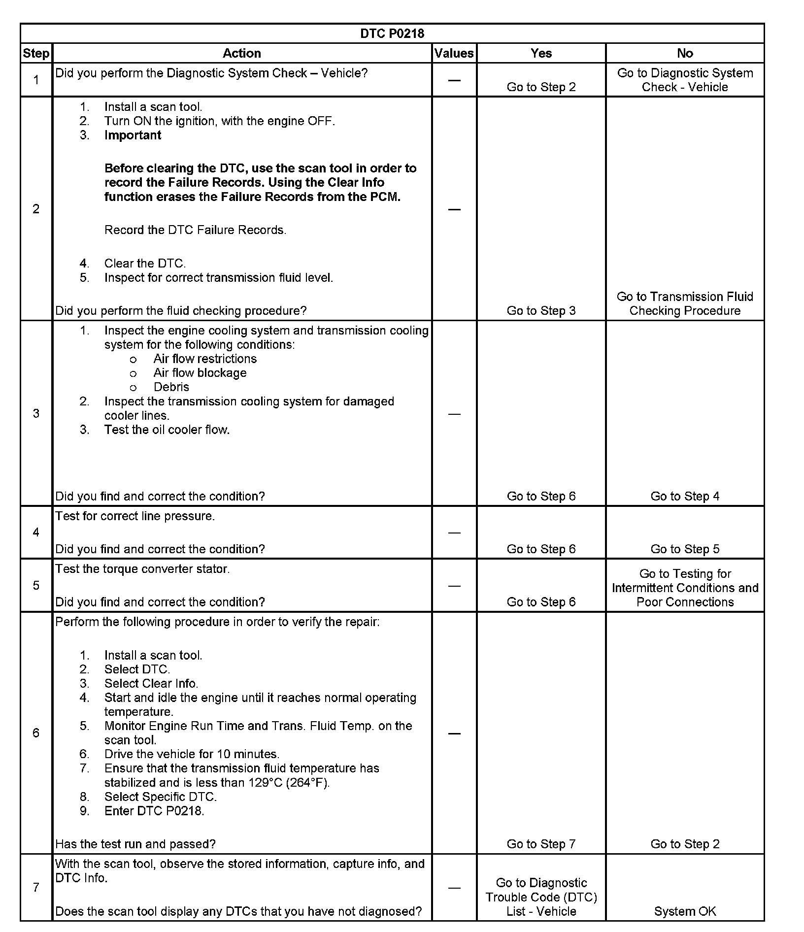 When the powertrain control module (PCM) detects a high transmission fluid temperature (TFT) for a long period of time, then DTC P0218 sets. DTC P0218 is a type C DTC.