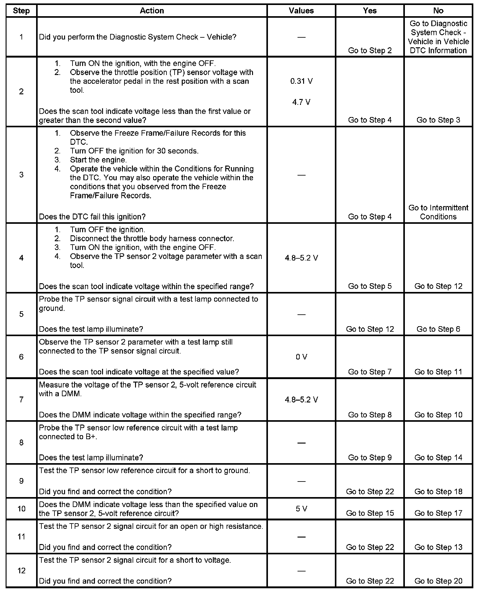 This provides the powertrain control module (PCM) with a signal voltage proportional to throttle plate movement. TP sensor 1 signal voltage at closed throttle is near the 5-volt reference and decreases as the throttle plate is opened. TP sensor 2 signal voltage at closed throttle is near the low reference and increases as the throttle plate is opened. If the PCM detects that the TP sensor 2 signal voltage is not within the predicted range, DTC P0220 sets.