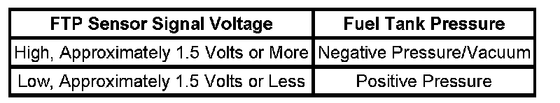 The table illustrates the relationship between the FTP sensor signal voltage and the EVAP system pressure/vacuum.