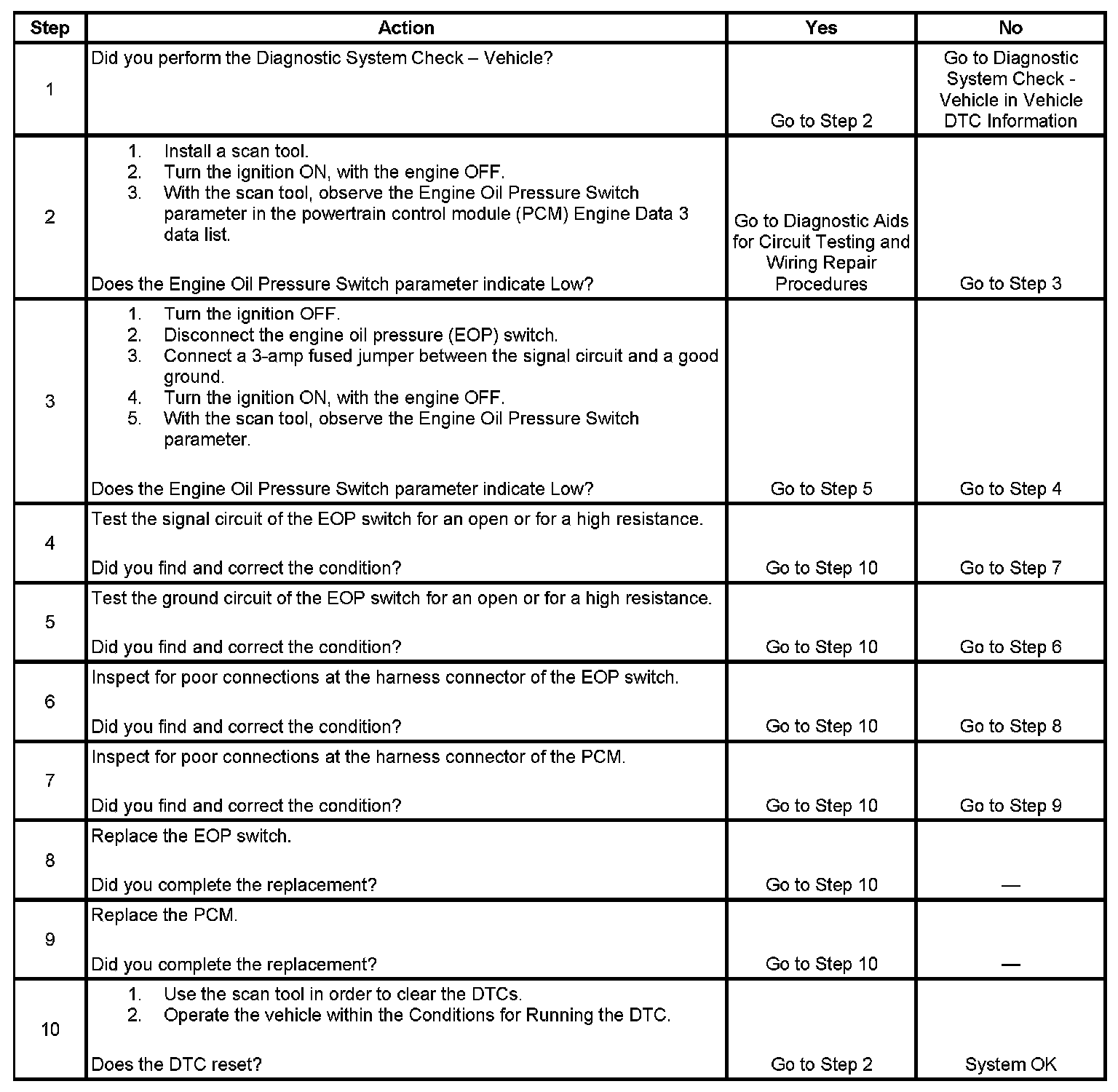 - The PCM detects that the oil pressure switch signal circuit is high.