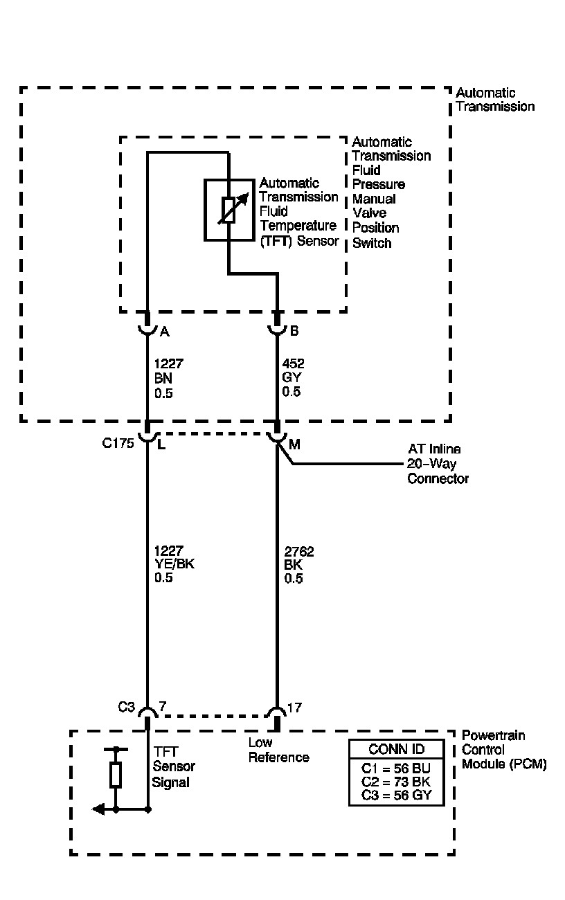 The automatic transmission fluid temperature (TFT) sensor is part of the automatic transmission fluid pressure (TFP) manual valve position switch. The TFT sensor is a resistor, or thermistor, which changes value based on temperature. The sensor has a negative-temperature coefficient. This means that as the temperature increases, the resistance decreases, and as the temperature decreases, the resistance increases. The powertrain control module (PCM) supplies a 5-volt reference signal to the sensor on the TFT sensor signal circuit and measures the voltage drop in the circuit. When the transmission fluid is cold, the sensor resistance is high and the PCM detects high signal voltage. As the fluid temperature warms to a normal operating temperature, the resistance becomes less and the signal voltage decreases. The PCM uses this information to control shift quality and torque converter clutch apply.