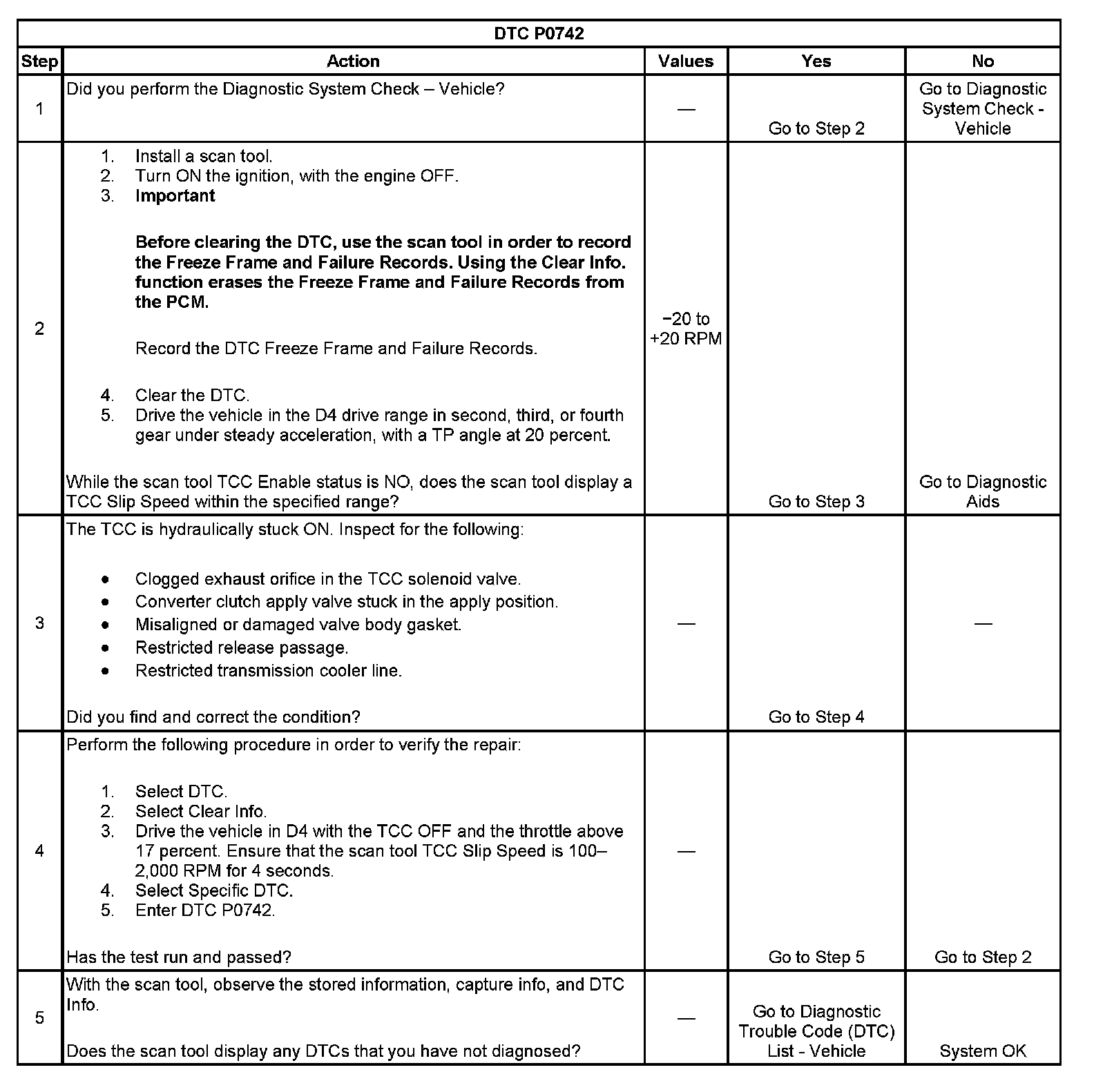 When the PCM detects low TCC slip when the TCC is commanded OFF, then DTC P0742 sets. DTC P0742 is a type B DTC.