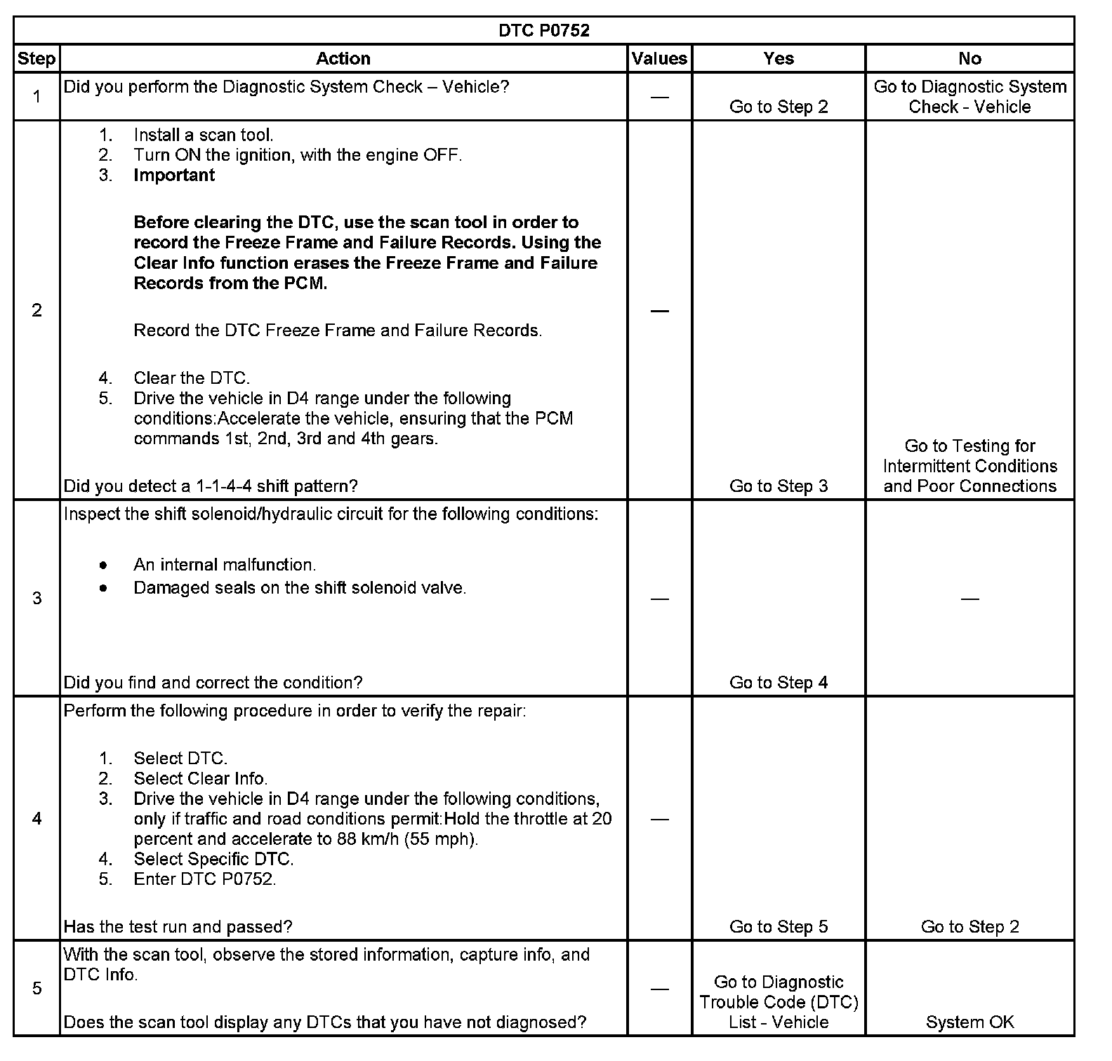 When the powertrain control module (PCM) detects a 1-1-4-4 shift pattern, then DTC P0752 sets. DTC P0752 is a type B DTC.