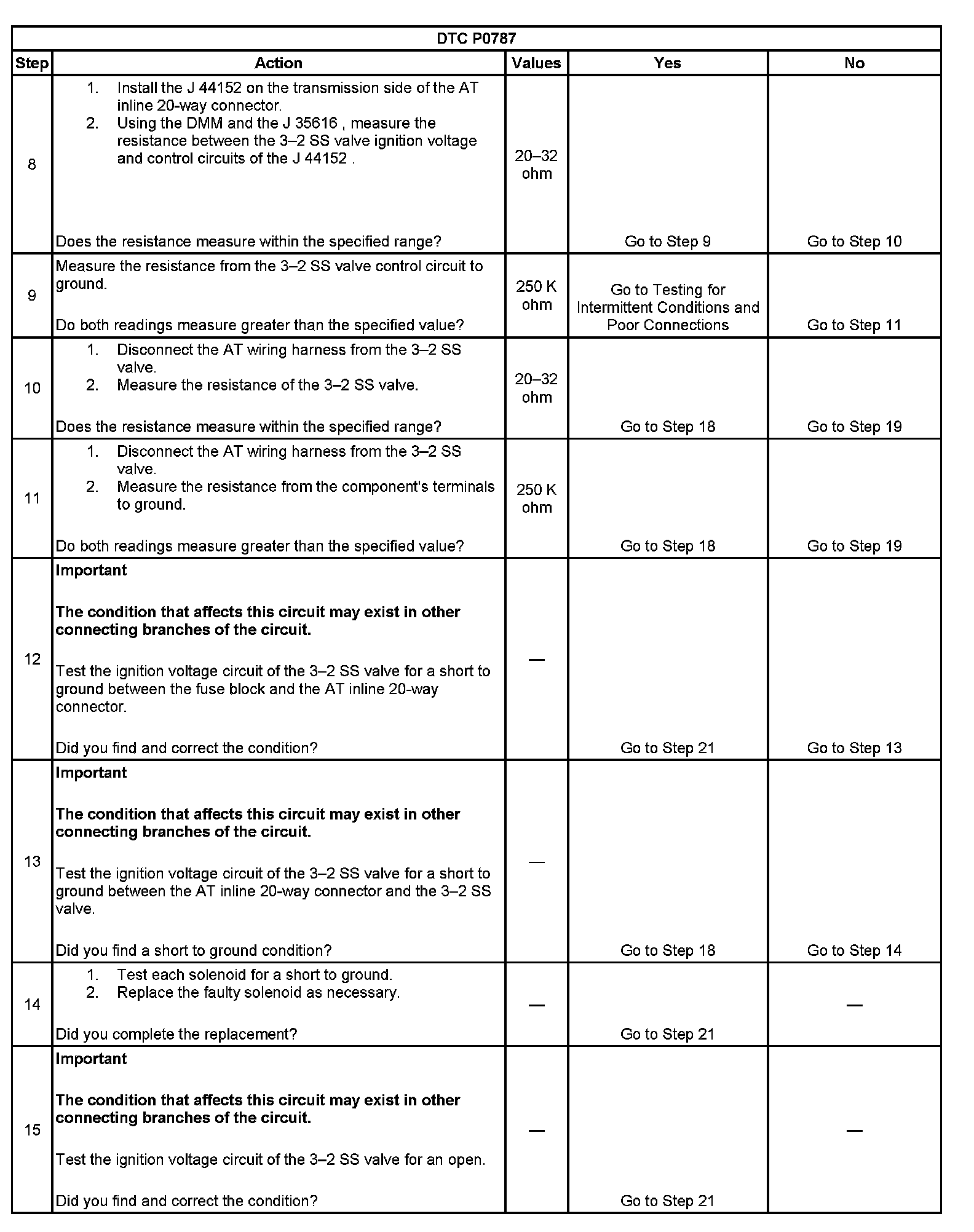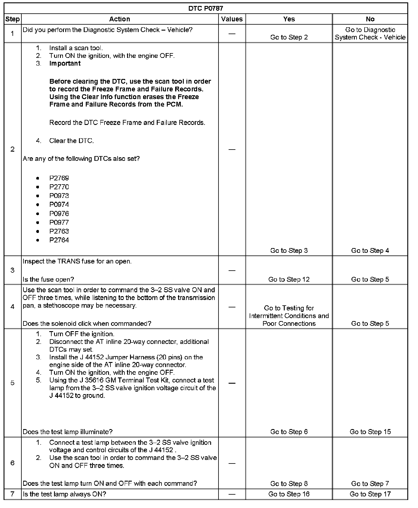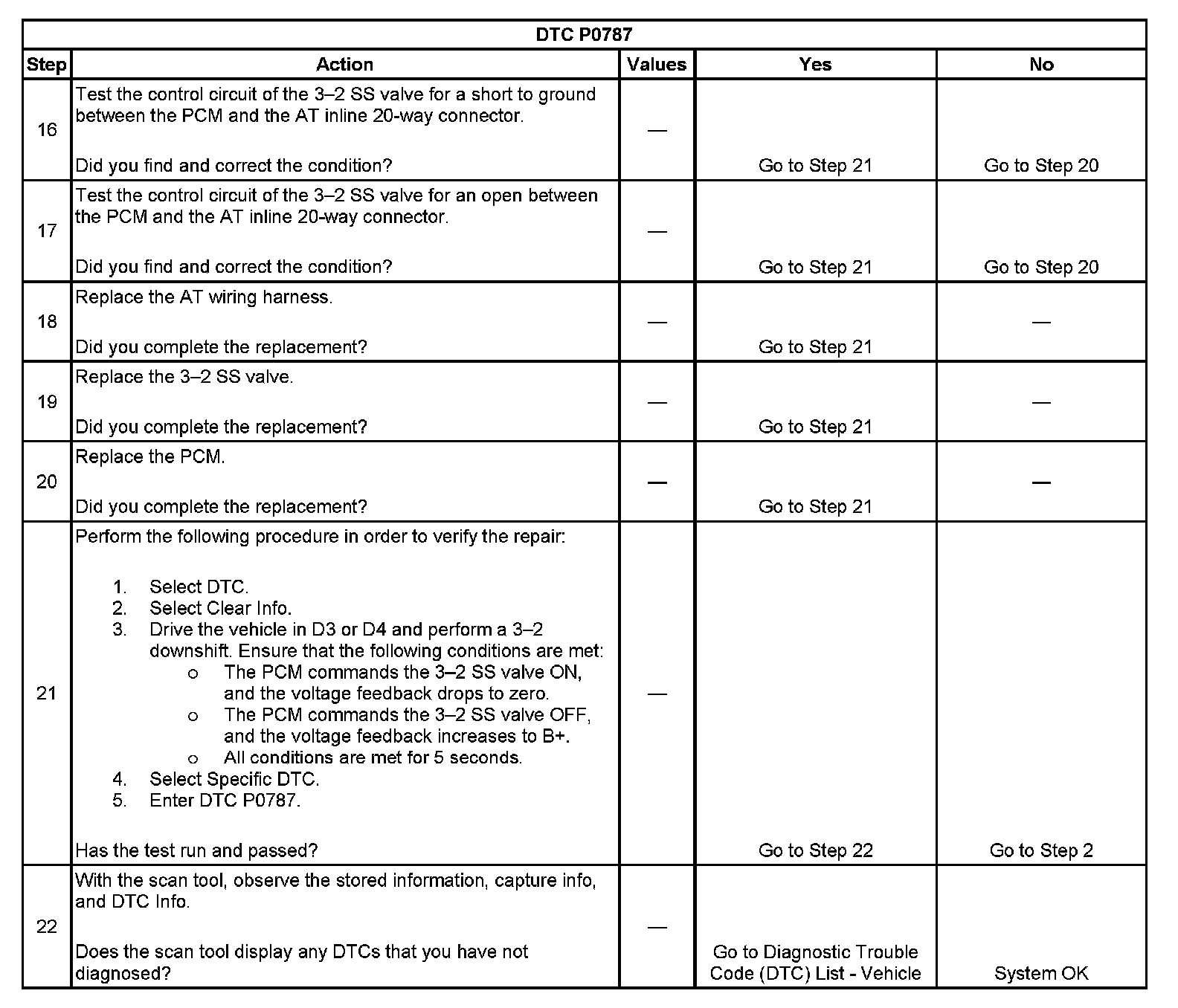 When the PCM detects a continuous open or short to ground in the 3-2 SS valve circuit, then DTC P0787 sets. DTC P0787 is a type A DTC.