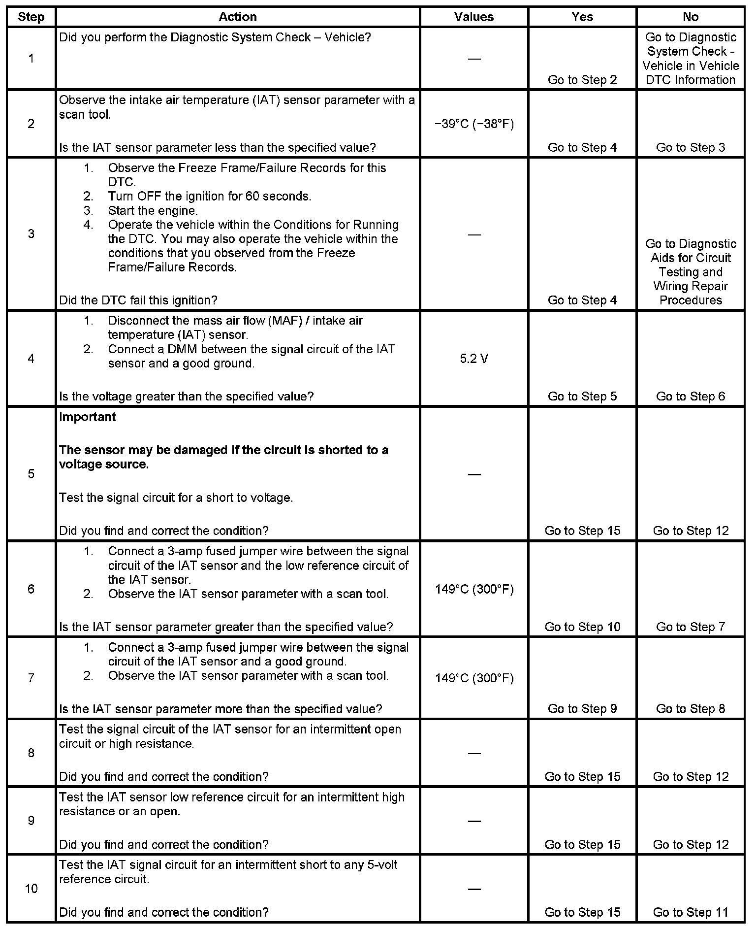 The PCM detects that the IAT sensor parameter is less than -39°C (-38°F) intermittently for more than 5 seconds.