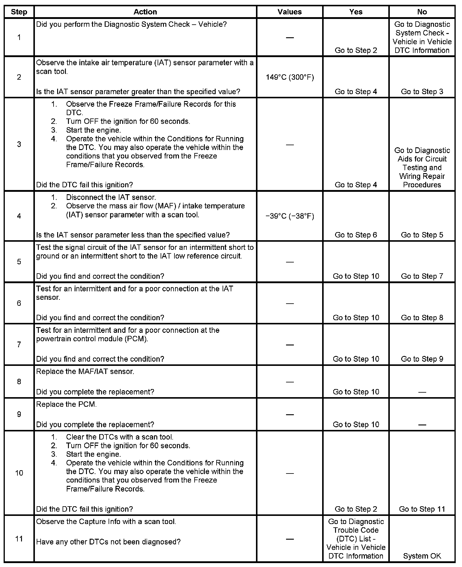 The PCM detects that the IAT sensor parameter is more than 149°C (300°F) intermittently for more than 5 seconds.