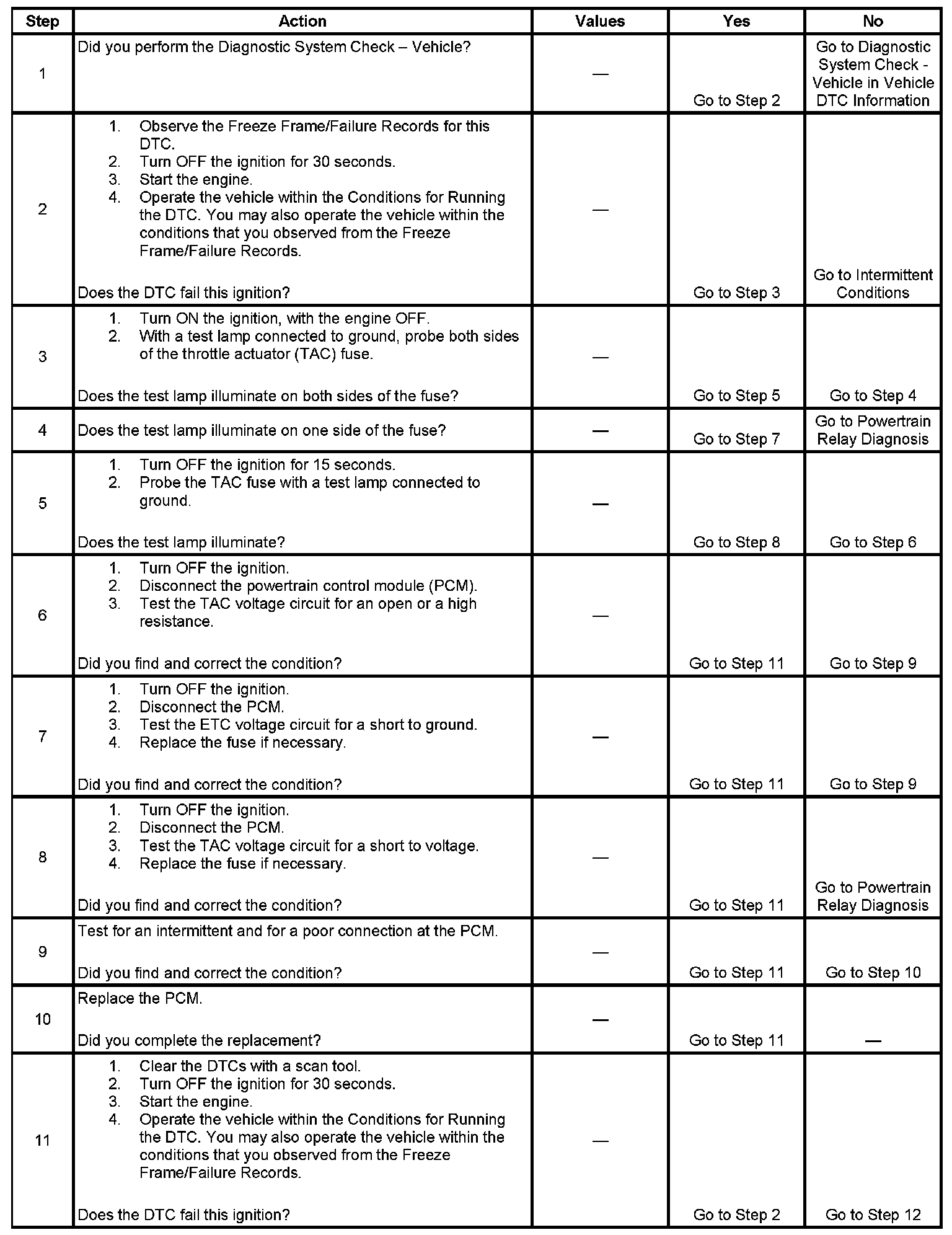 The throttle actuator control (TAC) system uses an ignition voltage supply separate from the powertrain control module (PCM) supply. If the PCM detects a voltage difference between the 2 circuits, this DTC sets.